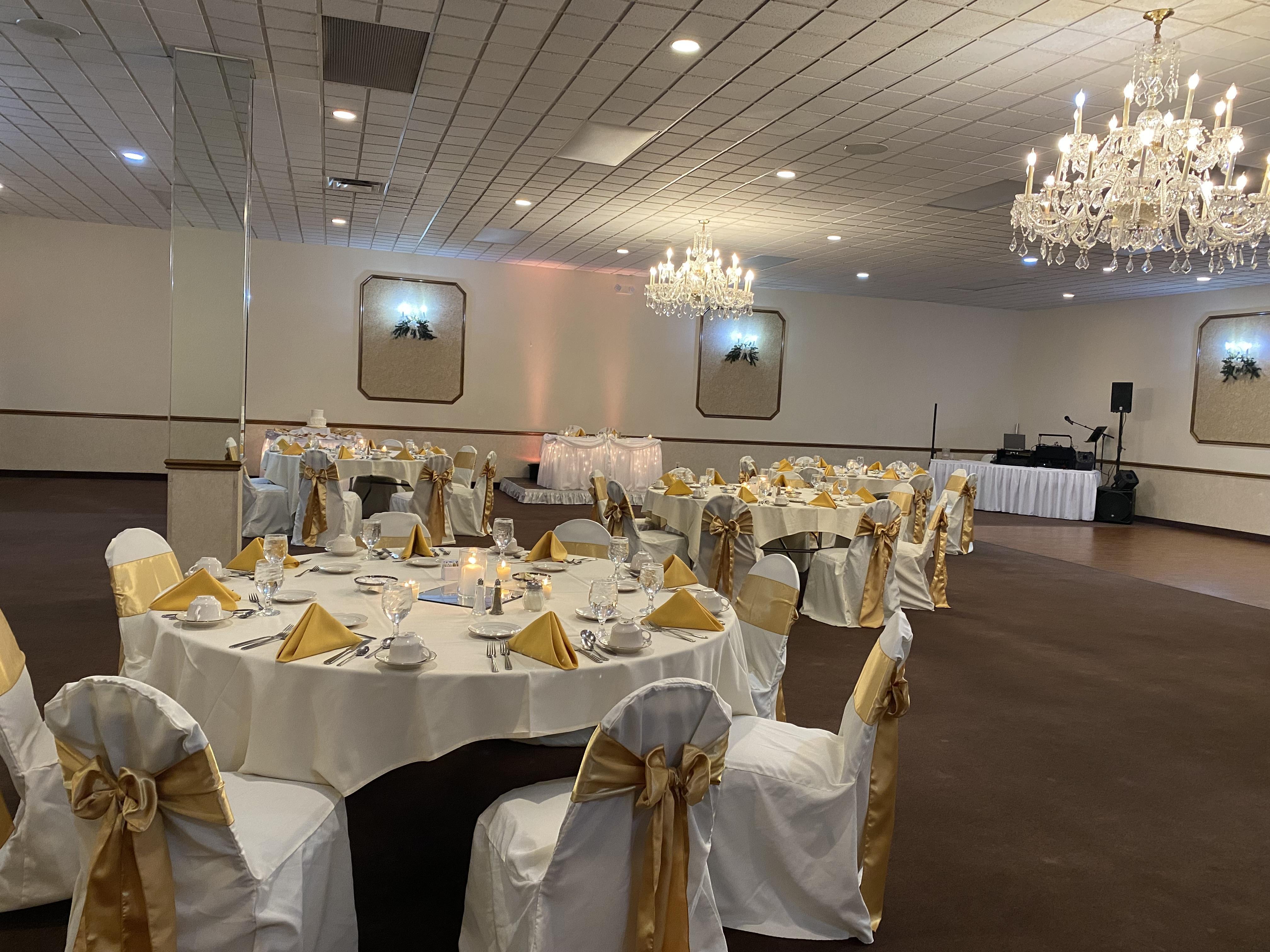 The Crystal room offers a "princess-like" atmosphere illuminated by brilliant crystal chandeliers. Sized at 51' x 53', the Crystal Room provides an intimate setting to accommodate up to 150 guests seated at round tables with formal linens and china. The Crystal Room's décor is complete with a 12 foot elevated ceiling, solid oak bar and wooden dance floor creating a highly desirable space for a variety of events. The Crystal Room also has a private bridal suite.