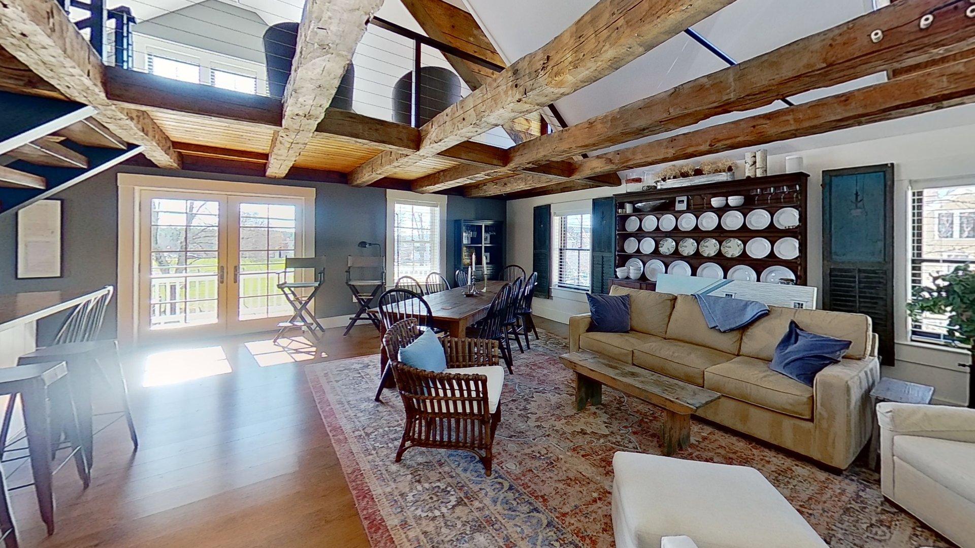 The restoration kept original floor joists and structural beams, which are exposed to provide texture and warmth.