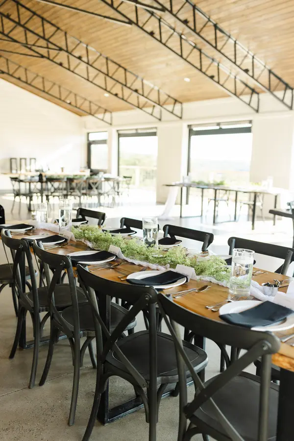 🪑 125 sleek black X-back chairs + handcrafted live-edge dining tables 🍽️ Plateware, flatware, glassware + chic black linen napkins 🎶 Built-in Sonos sound system to set the mood all evening 🌦️ Roll-down vinyl panels for a cozy vibe, rain or shine 🍸 Access to the adjacent Cocktail Lounge for mingling + happy hour