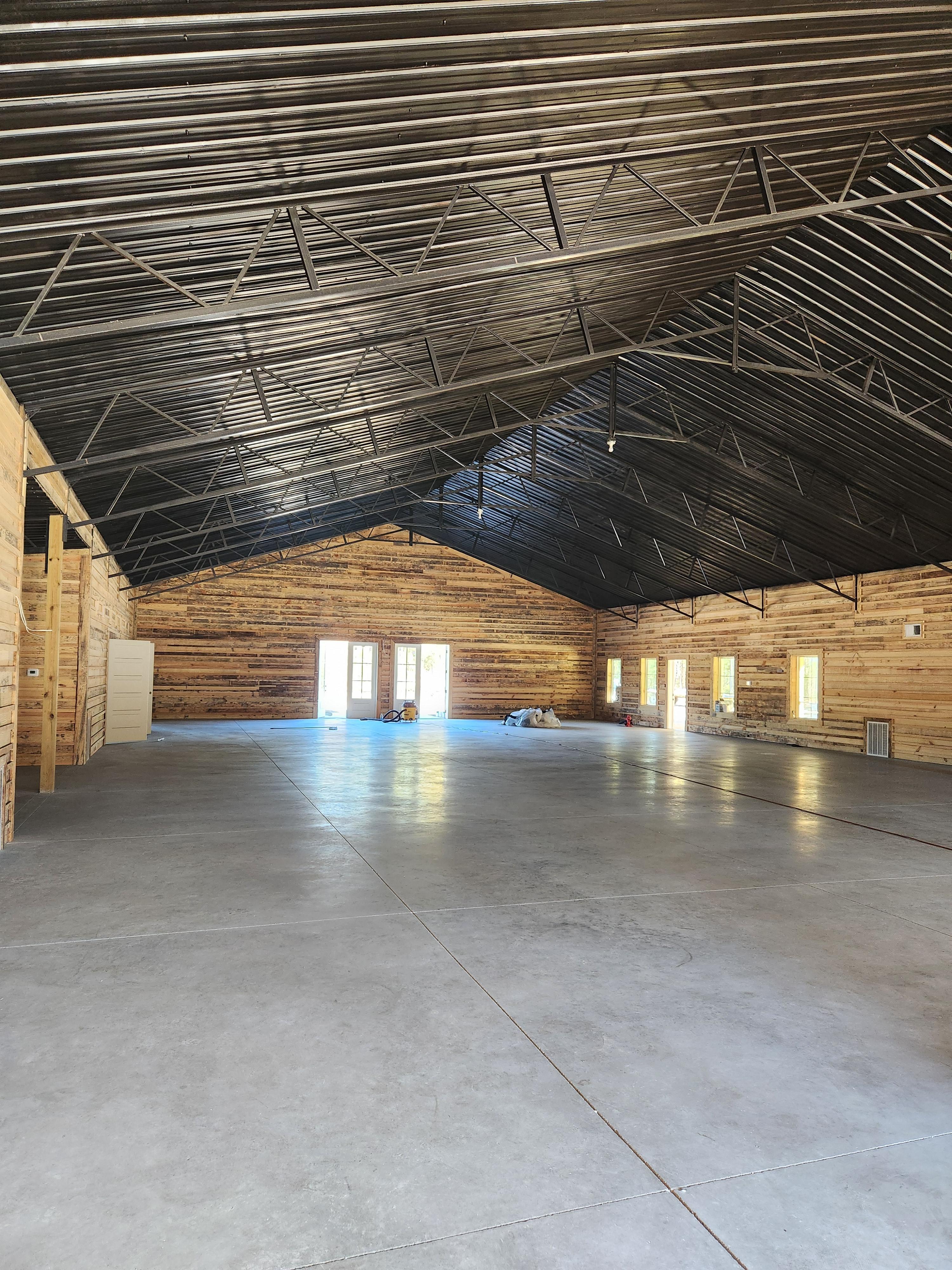 5000 sq ft main event space with additional footage for the Groom's room, Bride's suite, Kitchen prep area, small banquet room for 45 people, handicap restrooms, 550sq ft covered porch. Nestled in the woods, completely secluded but conveniently located to hotels, rv park, and Interstate 95
