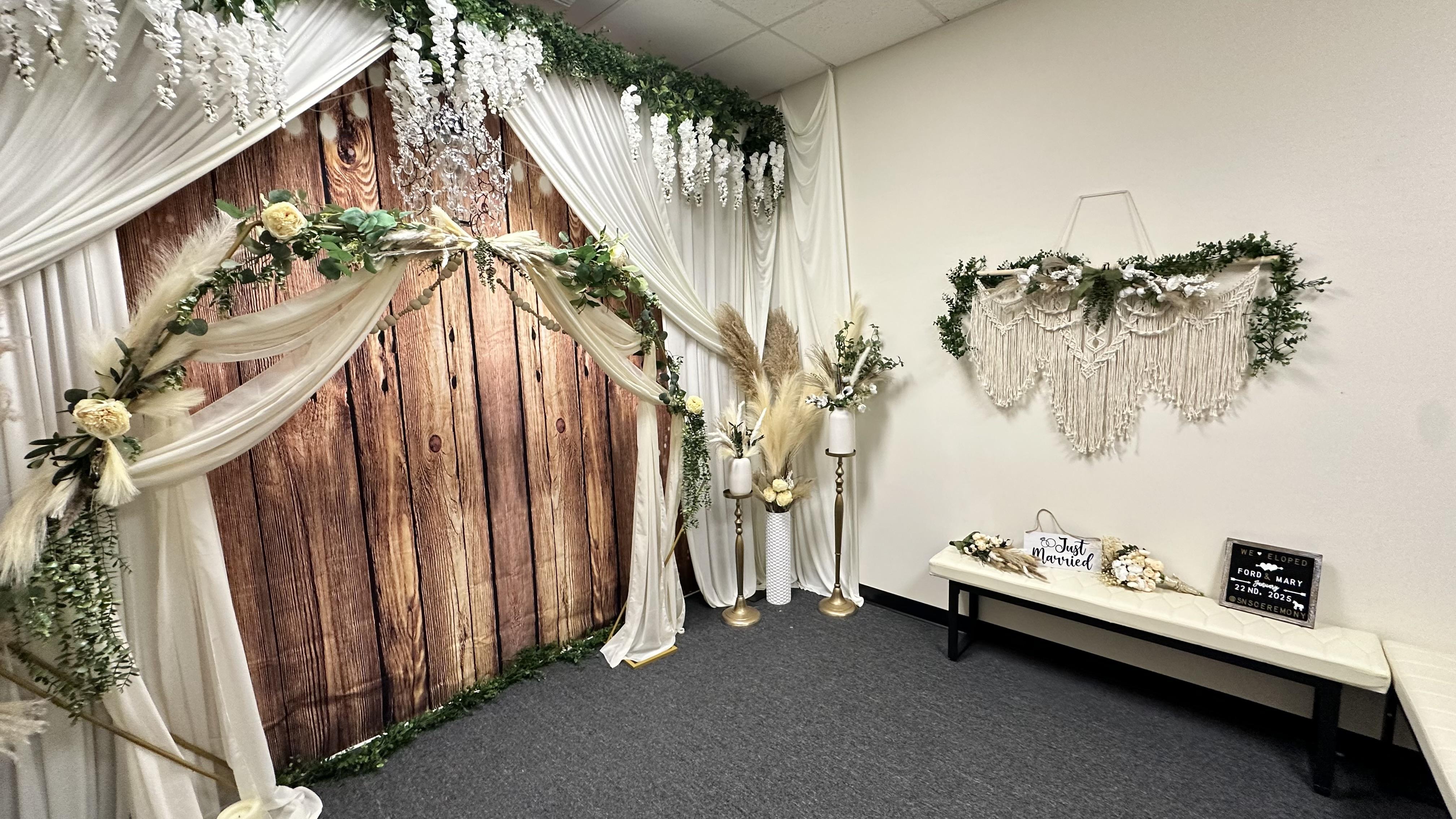 Our space is simple and cozy for your intimate ceremony. Weather in Bakersfield can be tricky but we will be comfortable year round in our climate controlled space. Our chapel is an affordable alternative to a courthouse wedding with photo ops to cherish your special milestone.