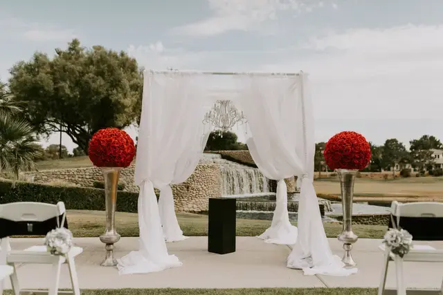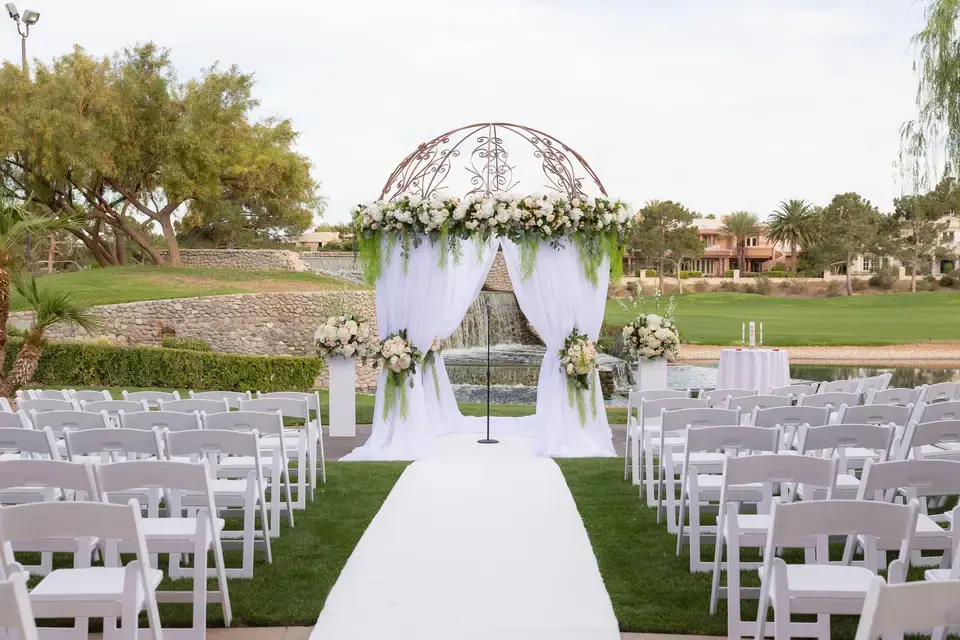 The Lakes Course Lawn is the most sought-after outdoor ceremony site at Spanish Trail. It is specifically designed to provide a "non-Vegas" feel, trading desert gravel for lush greenery and flowing water. The lawn is positioned so that couples exchange vows with a large, cascading stone waterfall directly behind them. The site is adjacent to the iconic stone-arched bridge—a favorite spot for bridal portraits and "first look" photos.