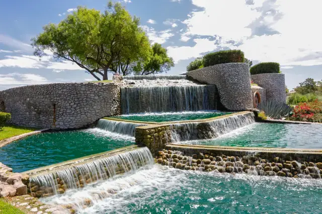 Beyond the waterfall, you get views of the quiet Lakes Course fairways and the Spring Mountains in the distance.