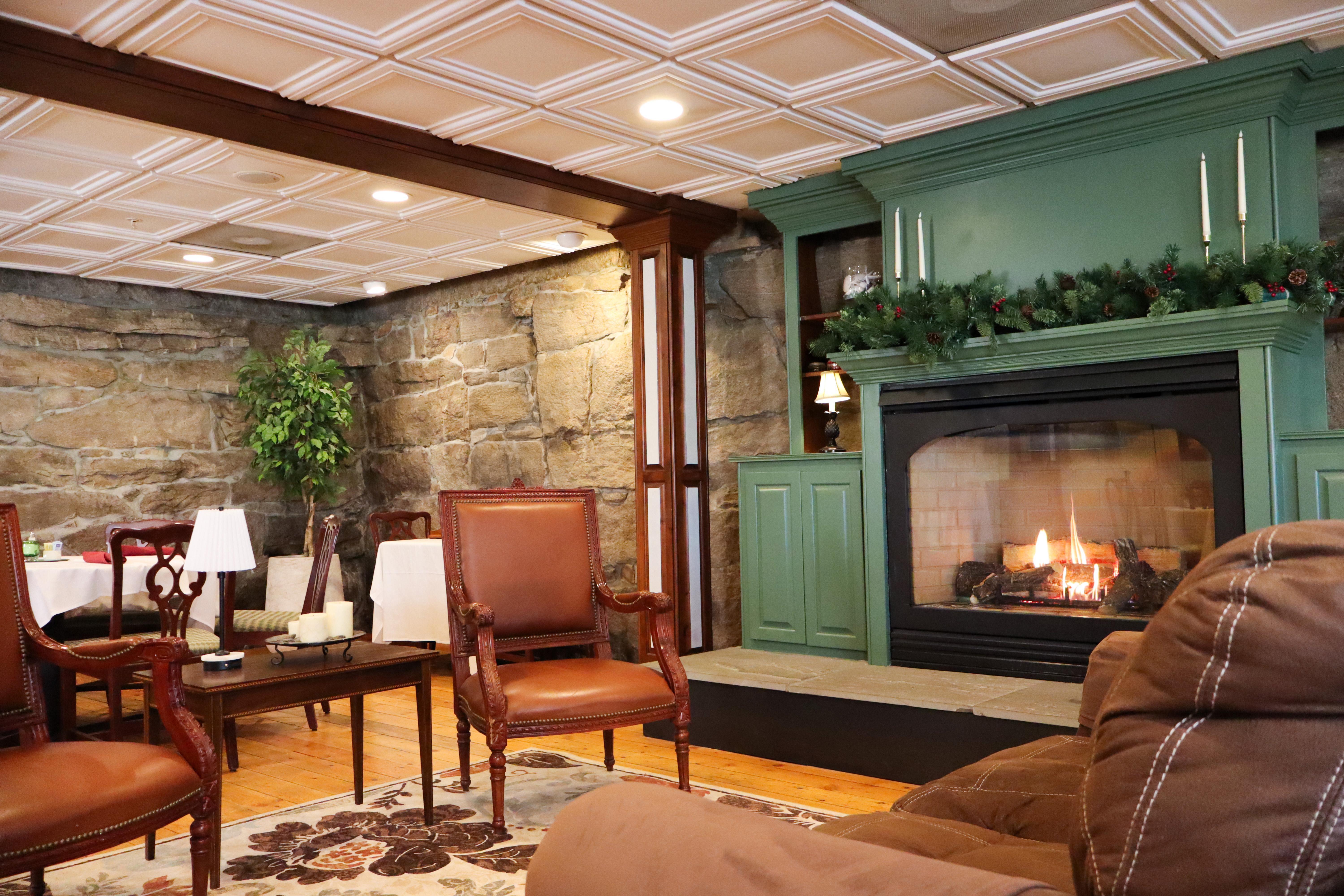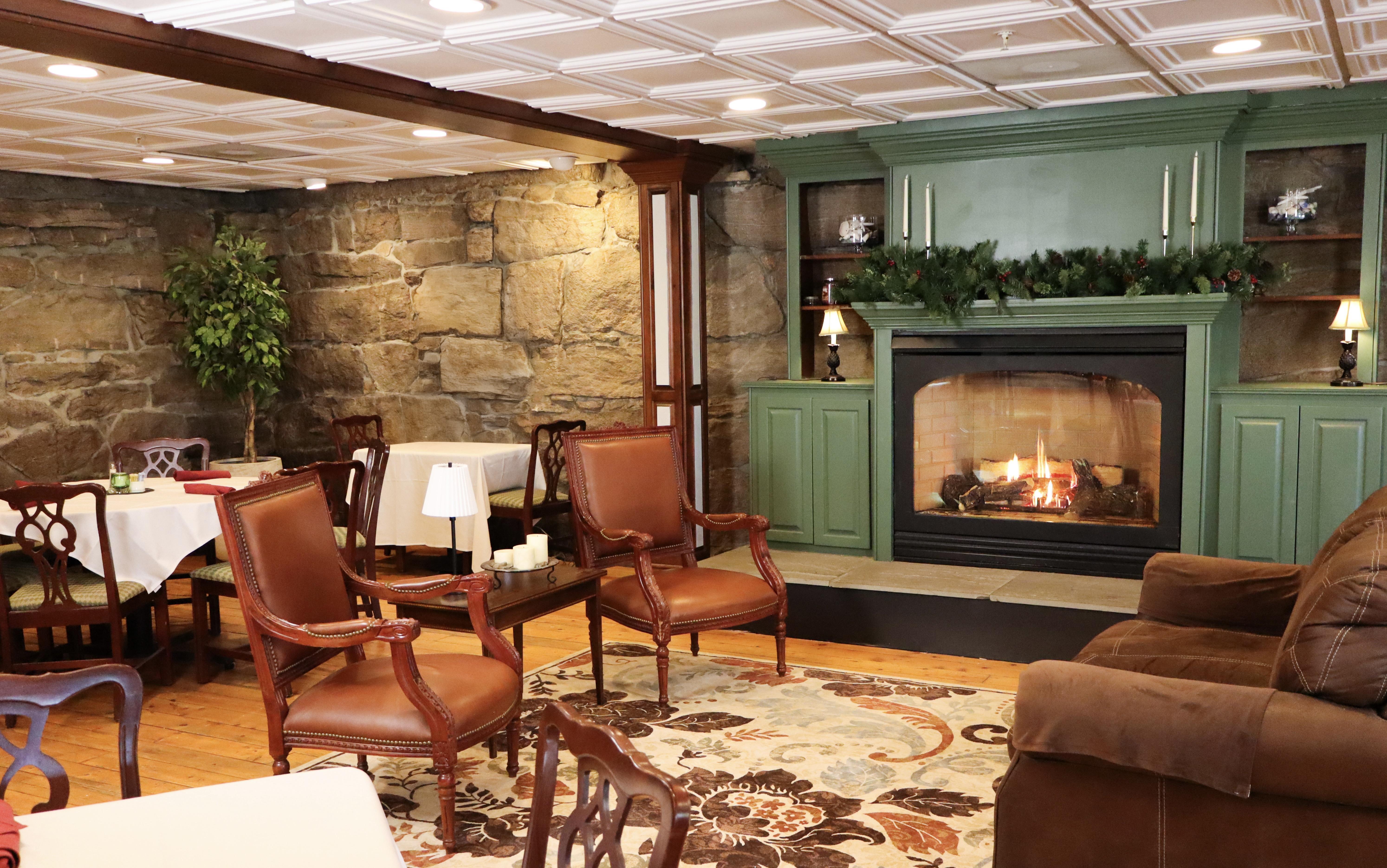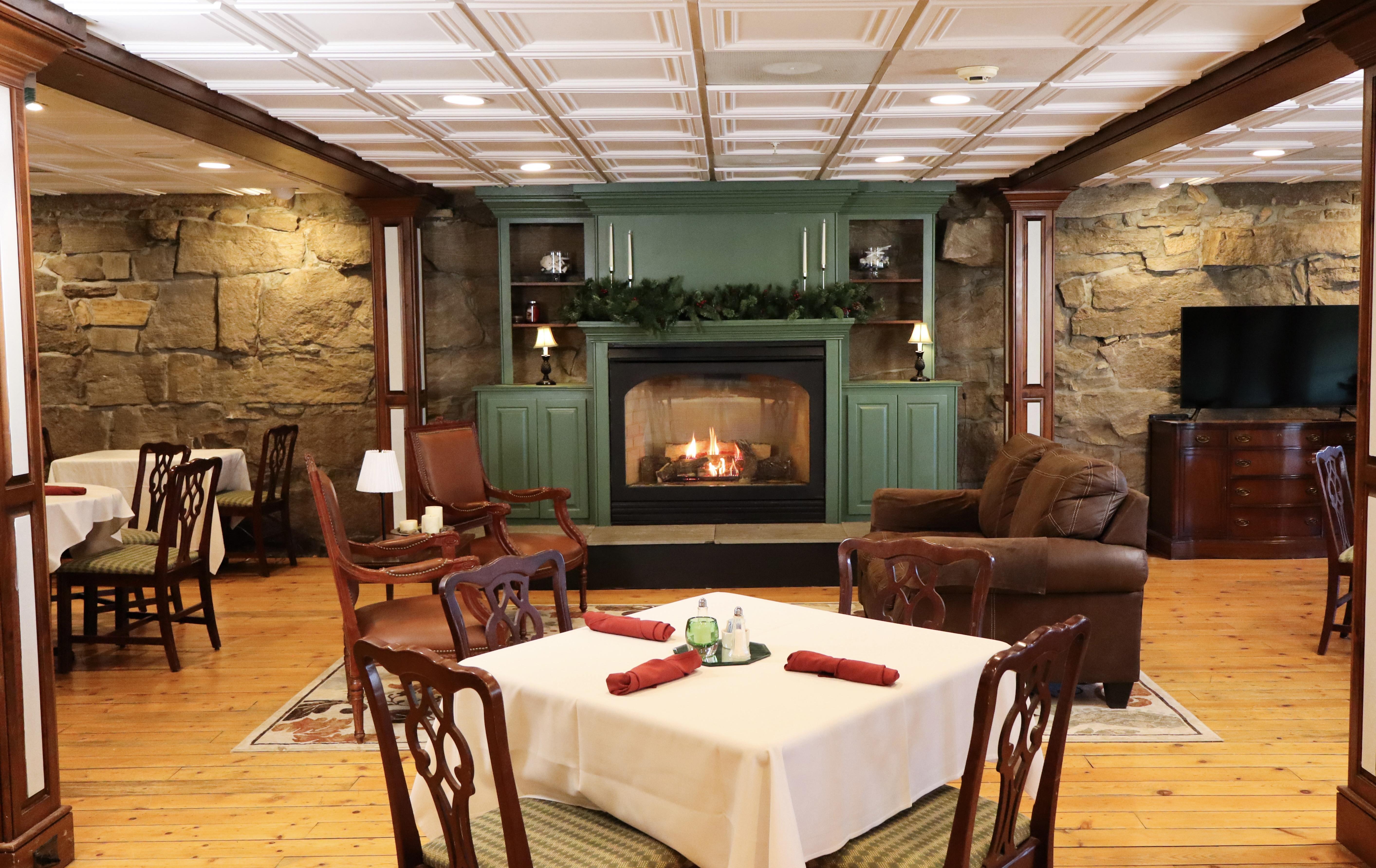 Our stone-walled dining room and large gas fireplace create a warm, romantic atmosphere for a private dinner celebration. It’s ideal for couples who want an elegant evening with close family and friends.
