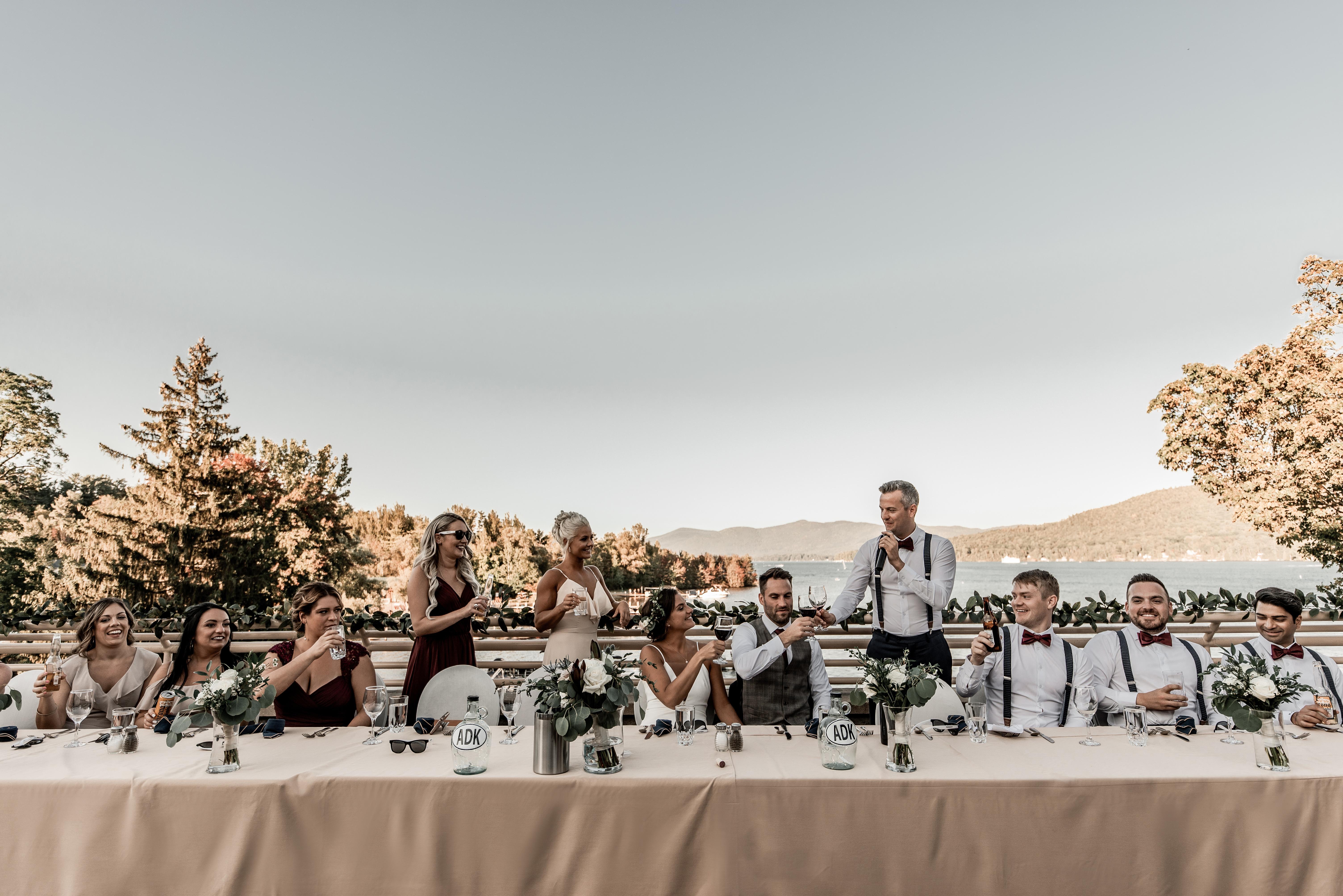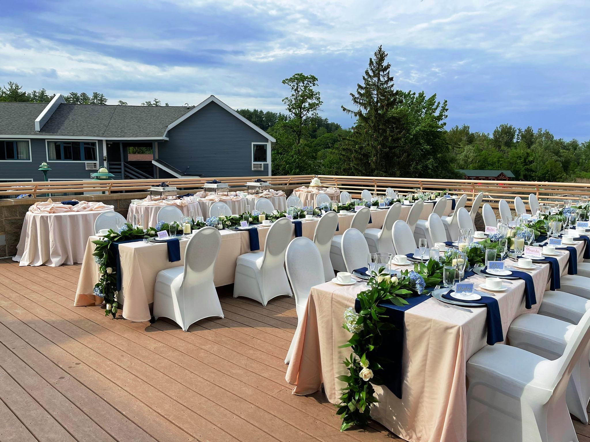 Exchange vows on our spacious ceremony space with the lake as your witness, then transition seamlessly onto our 900 square foot outdoor deck. The covered deck ensures your lakeside cocktail hour remains flawless, rain or shine. Transition into our 3,000-square-foot reception space for a night of dancing and fun with your guests with stunning views of Lake George.