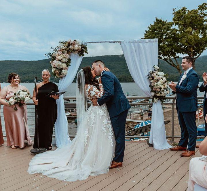 Surfside on the Lake is a hotel wedding venue situated in Lake George, New York. Offering stunning views of the majestic Lake George and the nearby Adirondack Mountains, this charming family-owned resort provides your once-in-a-lifetime celebration with a captivating backdrop. It features inviting event spaces, comfortable accommodations, and a professional event coordination team ready to bring your vision for your special day to life. Whatever your dream wedding might look like, Surfside on the Lake offers a selection of event spaces to choose from to make it a reality. Ceremonies can take place on the exquisite Lakefront Terrace, an enchanting outdoor area with scenic waterfront views. For receptions, there are three different event spaces to choose from, depending on your vision and the size of your guest list. Each space offers exquisite views of the natural surroundings.