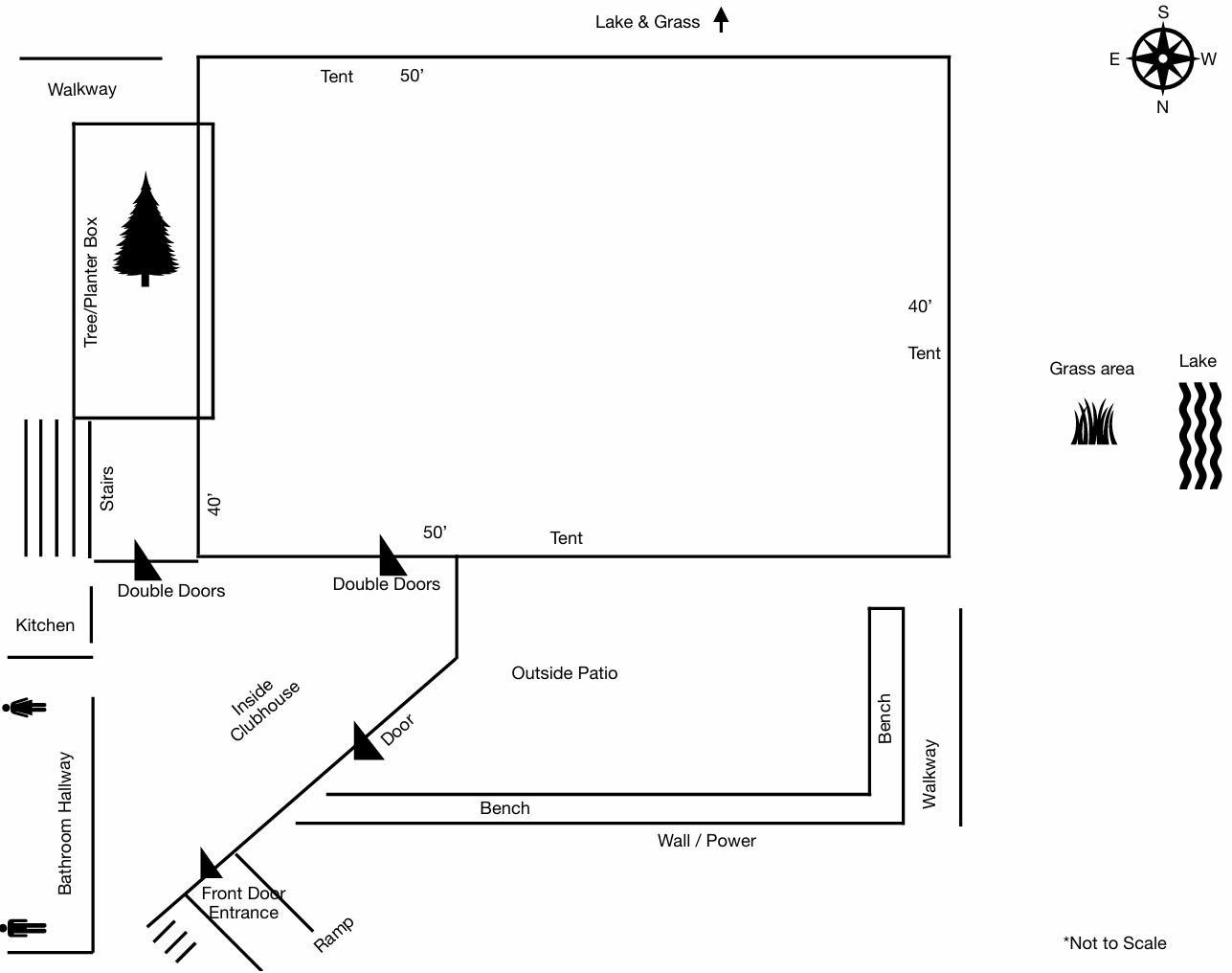 This space features a lakeside ceremony lawn beneath our thousand‑year‑old tree, a fully cordoned‑off private beach and lawns reserved exclusively for your event, a covered 2,000‑square‑foot patio with lighted canopy, an additional 650‑square‑foot uncovered patio, and a 3,300‑square‑foot/2300-square-foot usable clubhouse for indoor gatherings