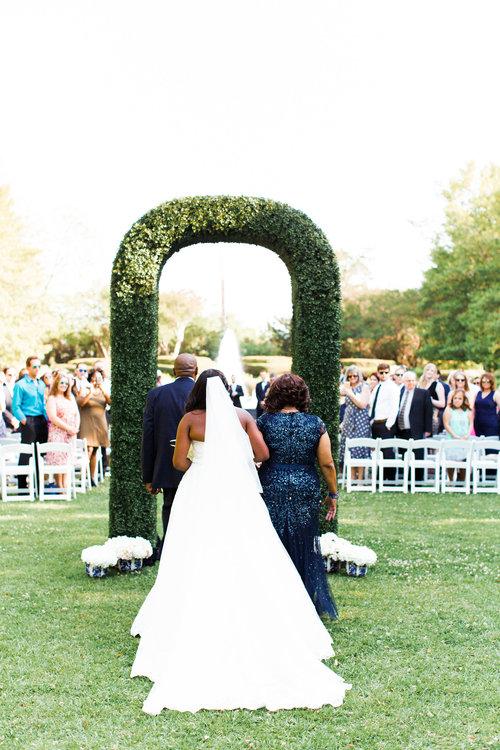 The Grand Allée is a majestic, long-form lawn that offers a sense of grand scale and symmetry for larger wedding celebrations. Flanked by tall, stately Savannah Holly trees that provide a natural architectural frame, this space draws the eye toward a magnificent 40-foot fountain at its peak. The linear design creates a dramatic aisle for ceremonies, while the expansive greenery provides ample room for large-scale outdoor events. It is a sophisticated choice for couples who envision a classic garden party aesthetic with grand focal points and plenty of open air for a stunning Dallas sunset.