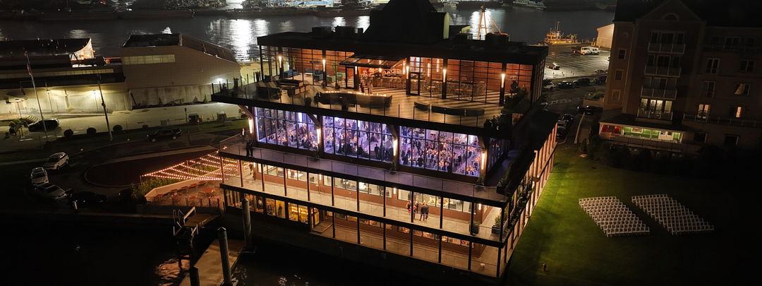 The atmosphere is anchored by a stunning two-story, double-sided fireplace and illuminated by eight custom antique brass geometric chandeliers. Your celebration flows seamlessly through beautifully designed areas, starting with a dynamic open-kitchen concept for cocktail hour. Move from the chic pre-function area into the elegant ballroom for your reception, or sneak away to the whiskey lounge for intimate moments.