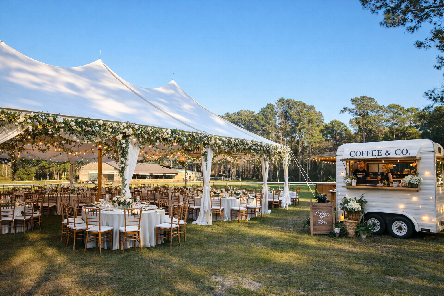 Experience the perfect blend of countryside warmth and sophisticated grace at our signature Grand Stables. This authentic wooden structure features a spacious, covered veranda where guests can relax in vibrant red lounge seating while taking in serene estate views. With its rich wood textures, classic wagon wheel accents, and a striking red-door entrance, this space provides a nostalgic and picturesque backdrop for your cocktail hour or an intimate outdoor celebration.