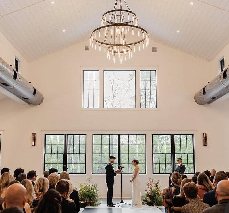 -Dimmers on all lighting. -2 bars so there is never a line. -dramatic high ceilings -stunning chandeliers -stone fireplace -endless windows