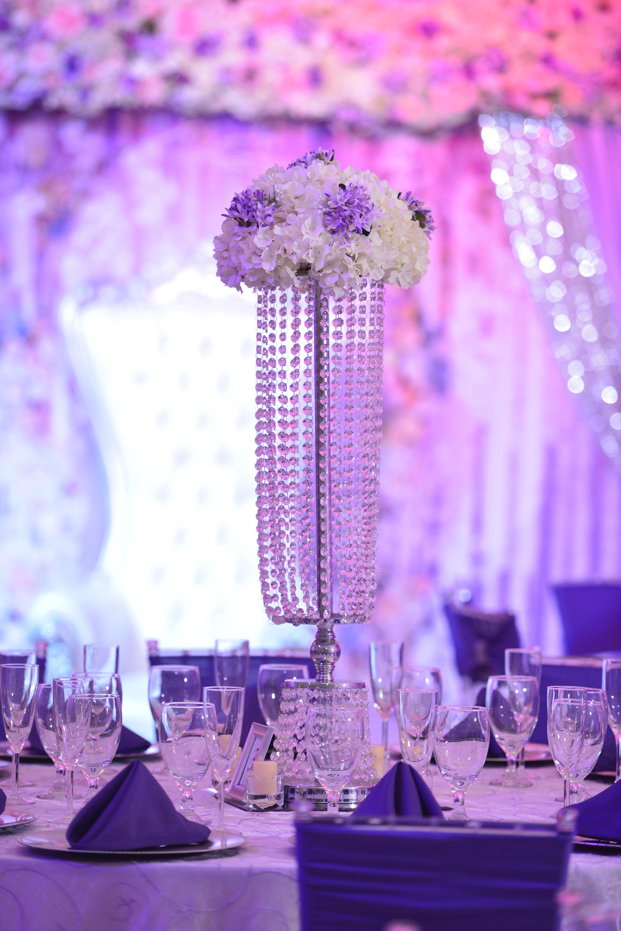 Service Staff Event Coordinator Full Decoration: Table linens & Overlays, Fabric napkins and rings, Charger plates (customized colors available), elegant Centerpieces with flower arrangements. Stage Decor, Gift table decorated, Cake table decorated, Candy Station decorated. Welcome cocktail Food, Cake, Toast, Professional DJ, sound and light Projector and Screen Special illumination (light show) Photo booth with prints and props Photography and video service Private parking for 150 cars