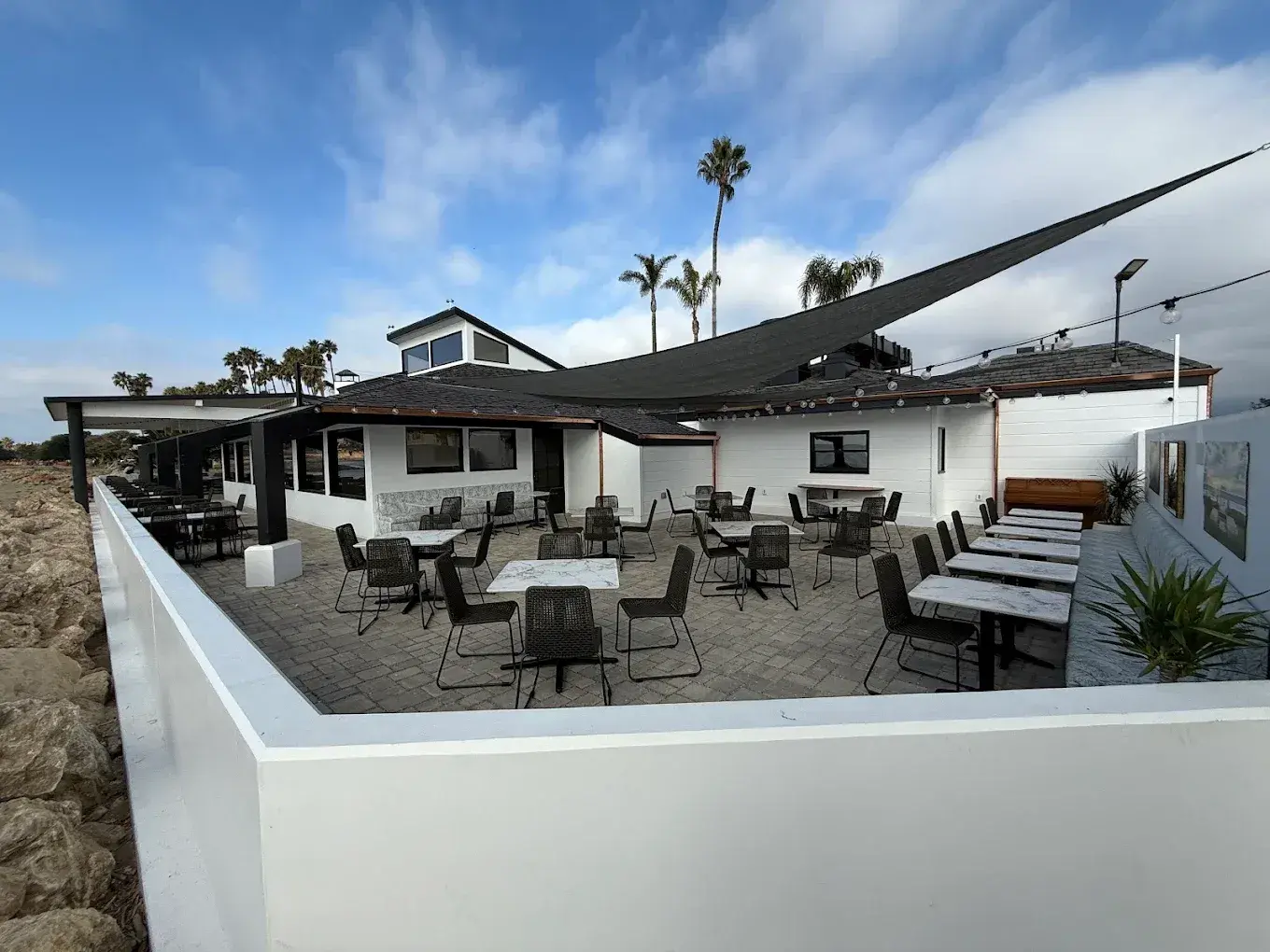 A large, covered patio with coastal elegance and sea views.