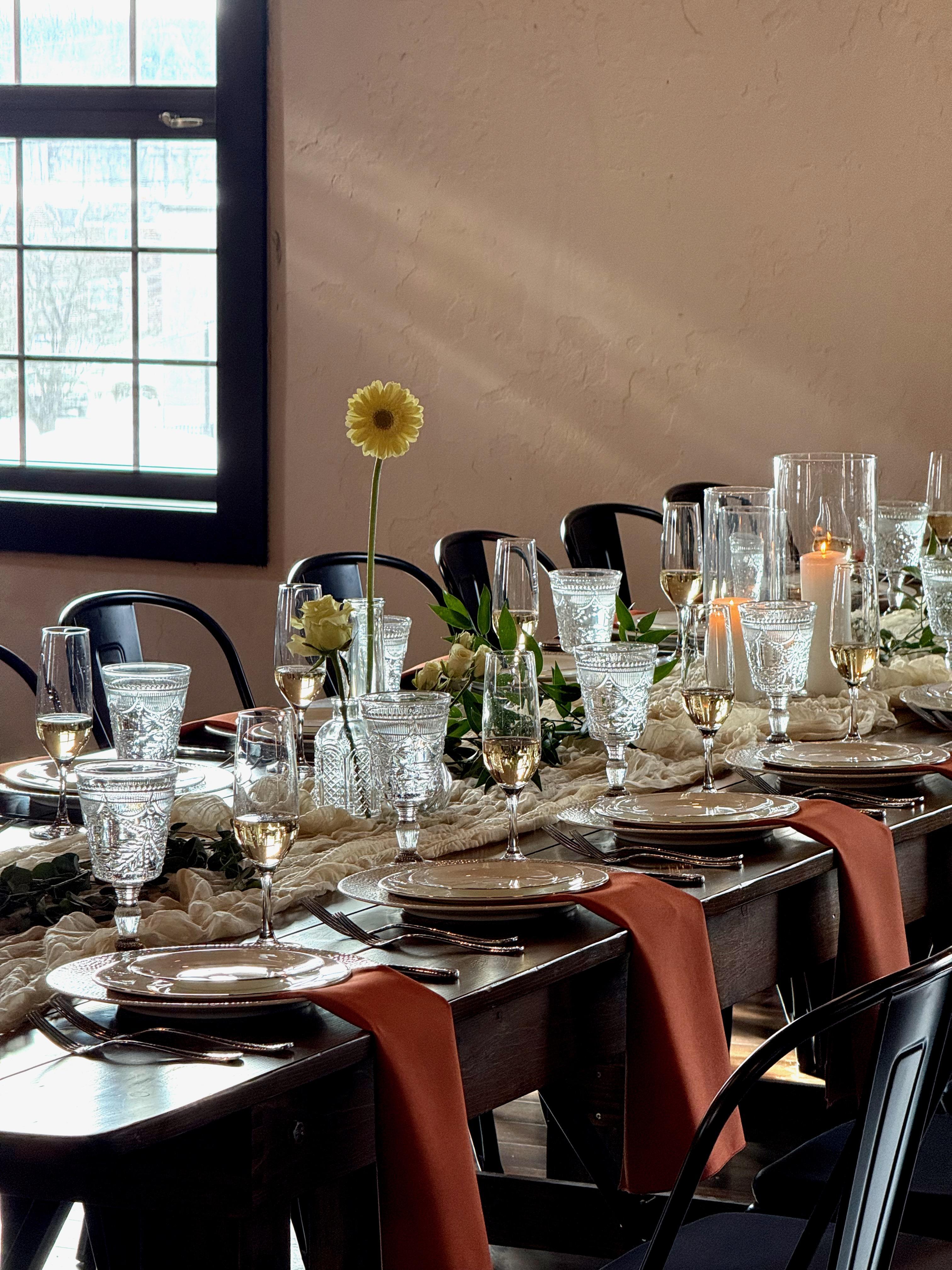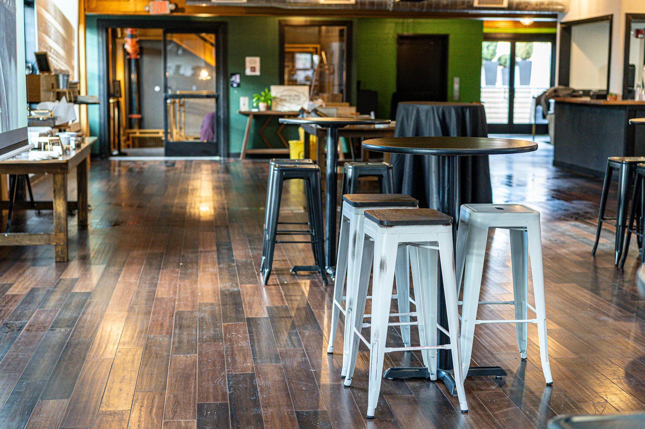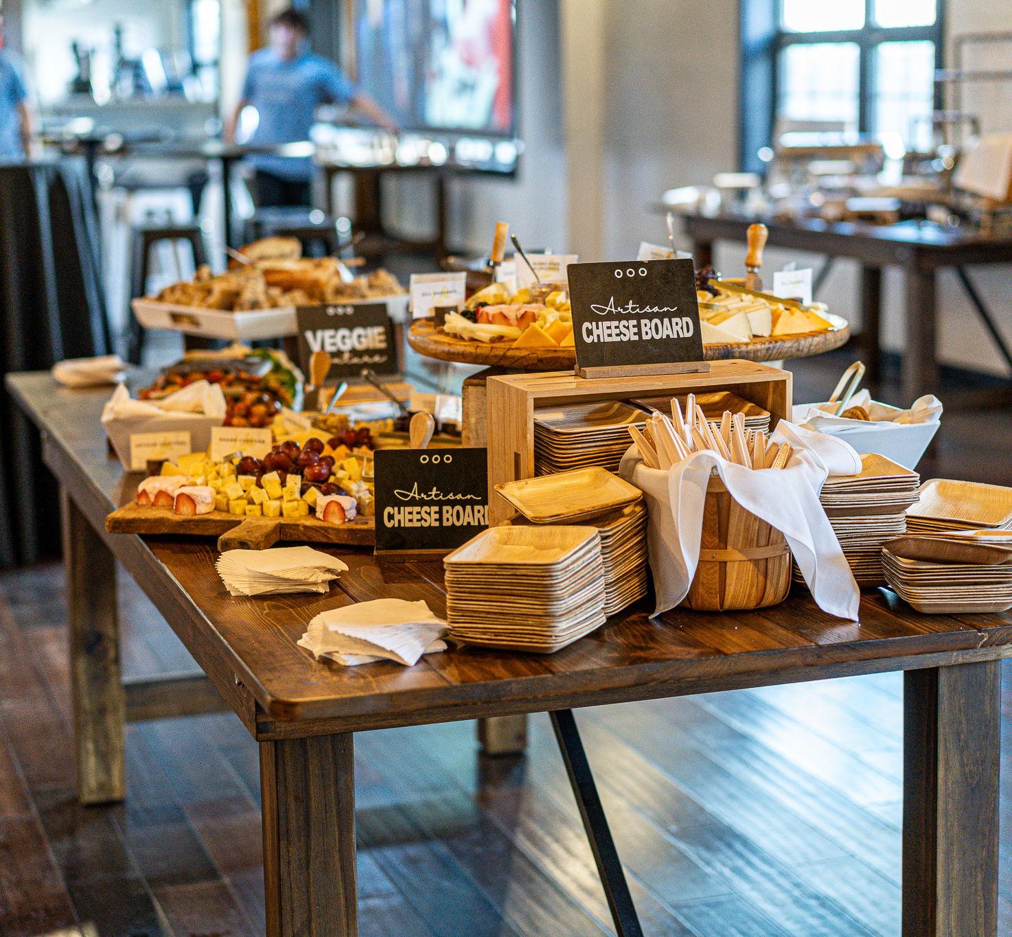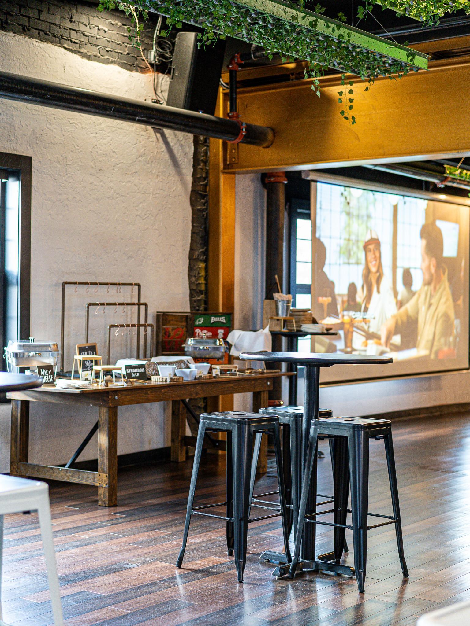 Farmhouse finished wooden tables Wooden high tops with bar stools Metal farm chairs Setup and breakdown Completely private space Audio Visual: 3 Built in projectors with 150 inch screen 60-inch smart TV access Speaker System Microphones Wi-Fi access