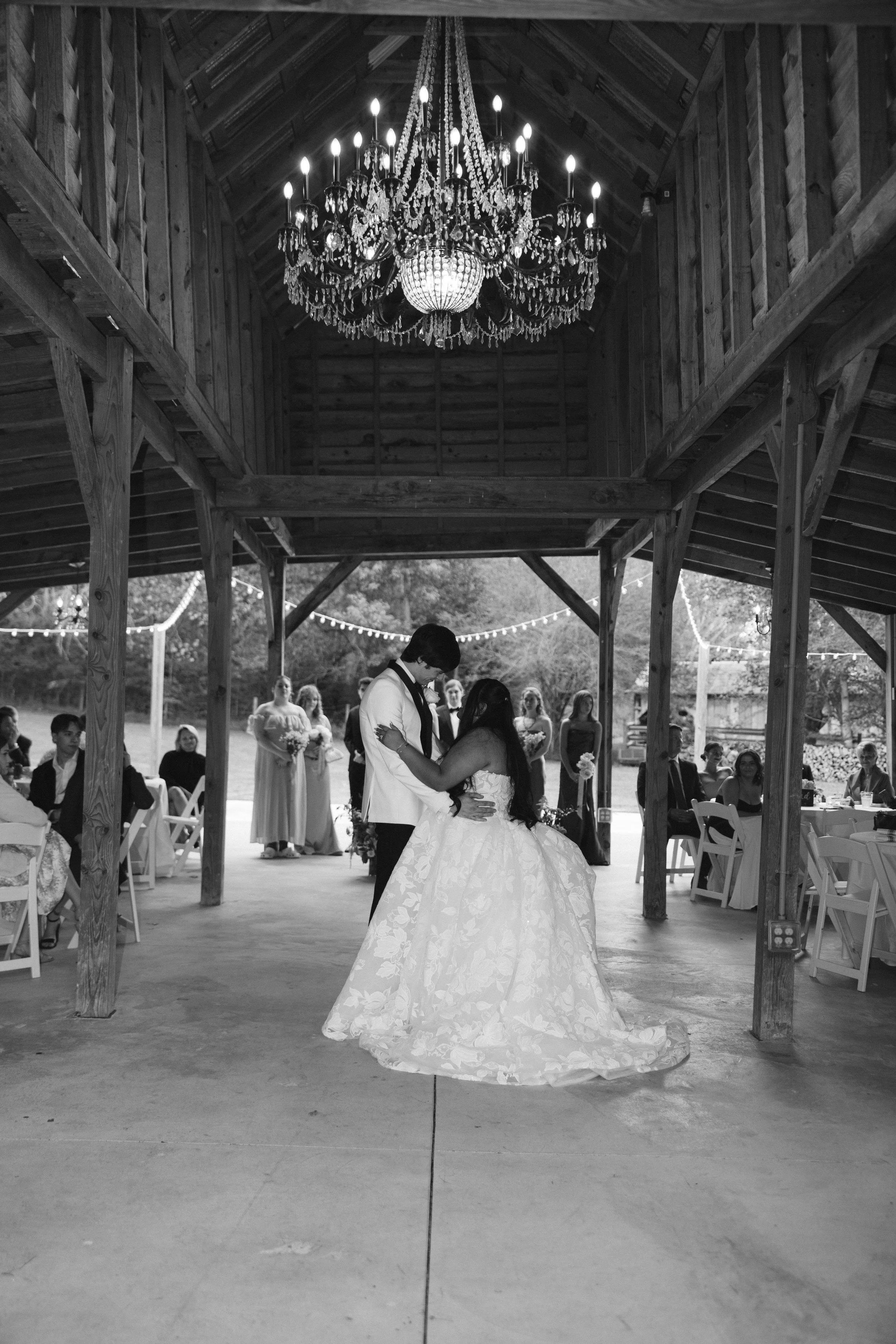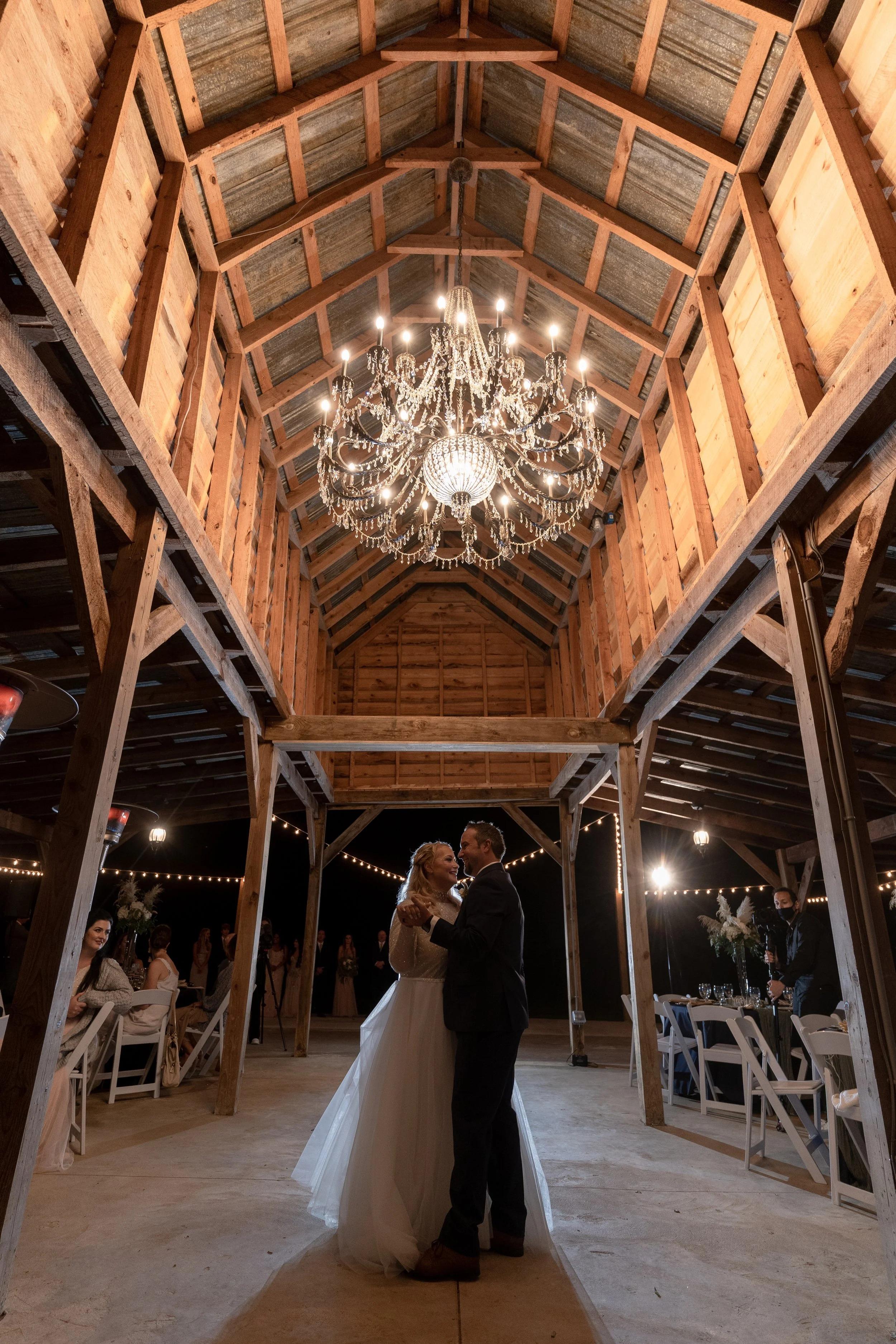 Embrace the perfect blend of rustic charm and sophisticated elegance in our Grand Pavilion Barn. This open-air wooden structure features soaring vaulted ceilings and exposed timber beams that create a majestic, airy atmosphere for your celebration. At the heart of the space hangs a breathtaking crystal chandelier, casting a warm, romantic glow over the polished concrete dance floor. Surrounded by lush greenery and illuminated by delicate string lights, this versatile pavilion offers a seamless connection to the outdoors, making it an idyllic setting for a picturesque reception or a starlit first dance.