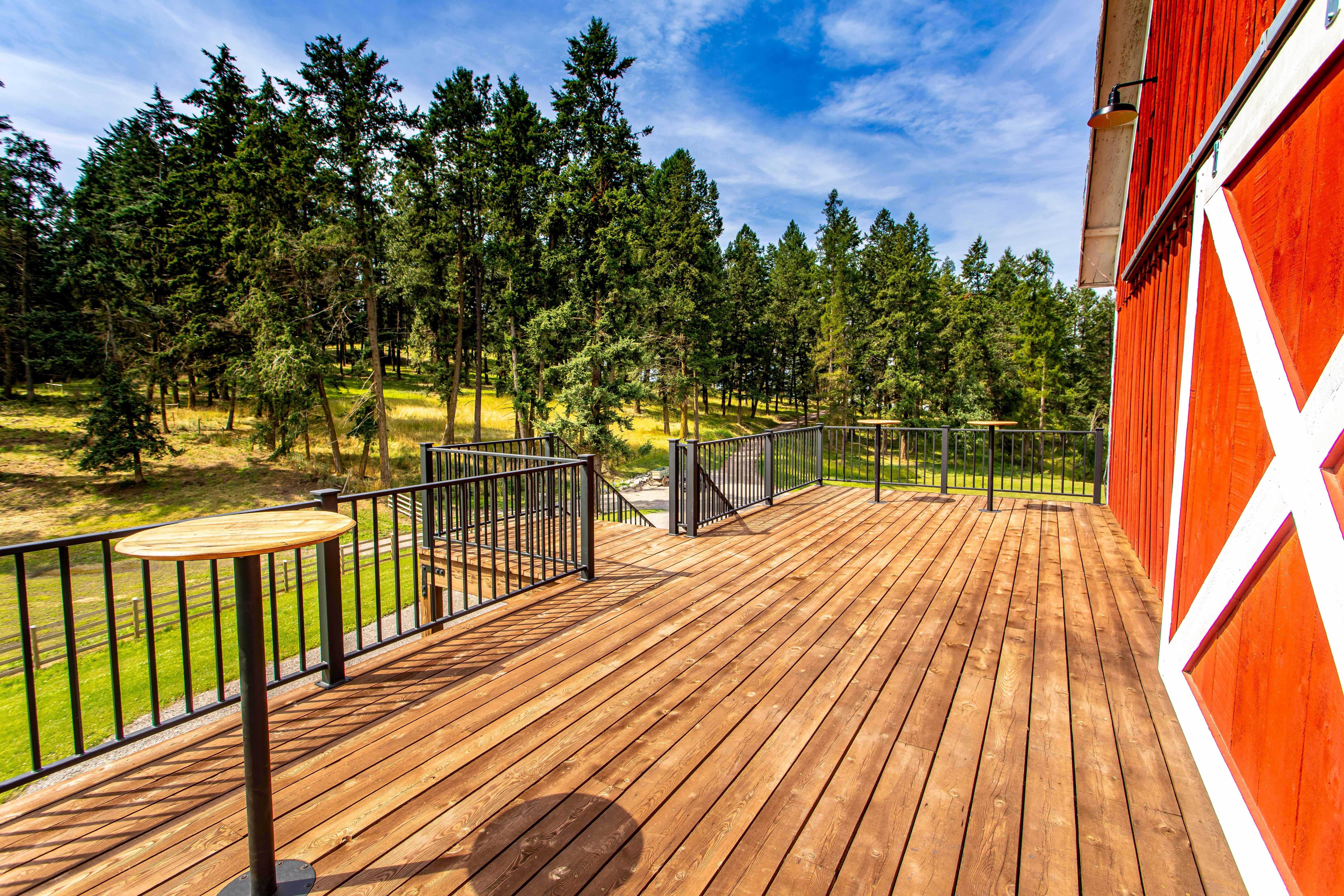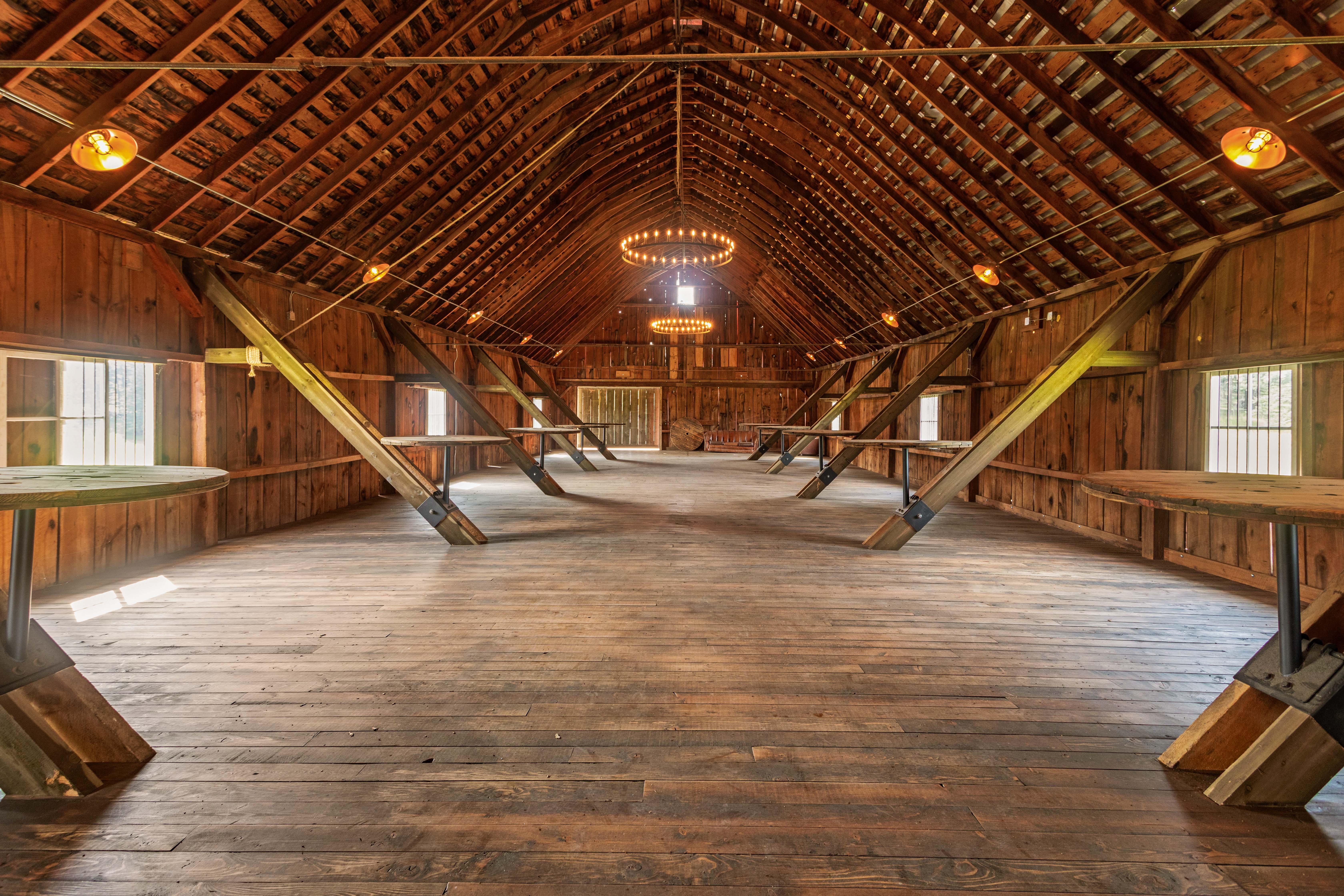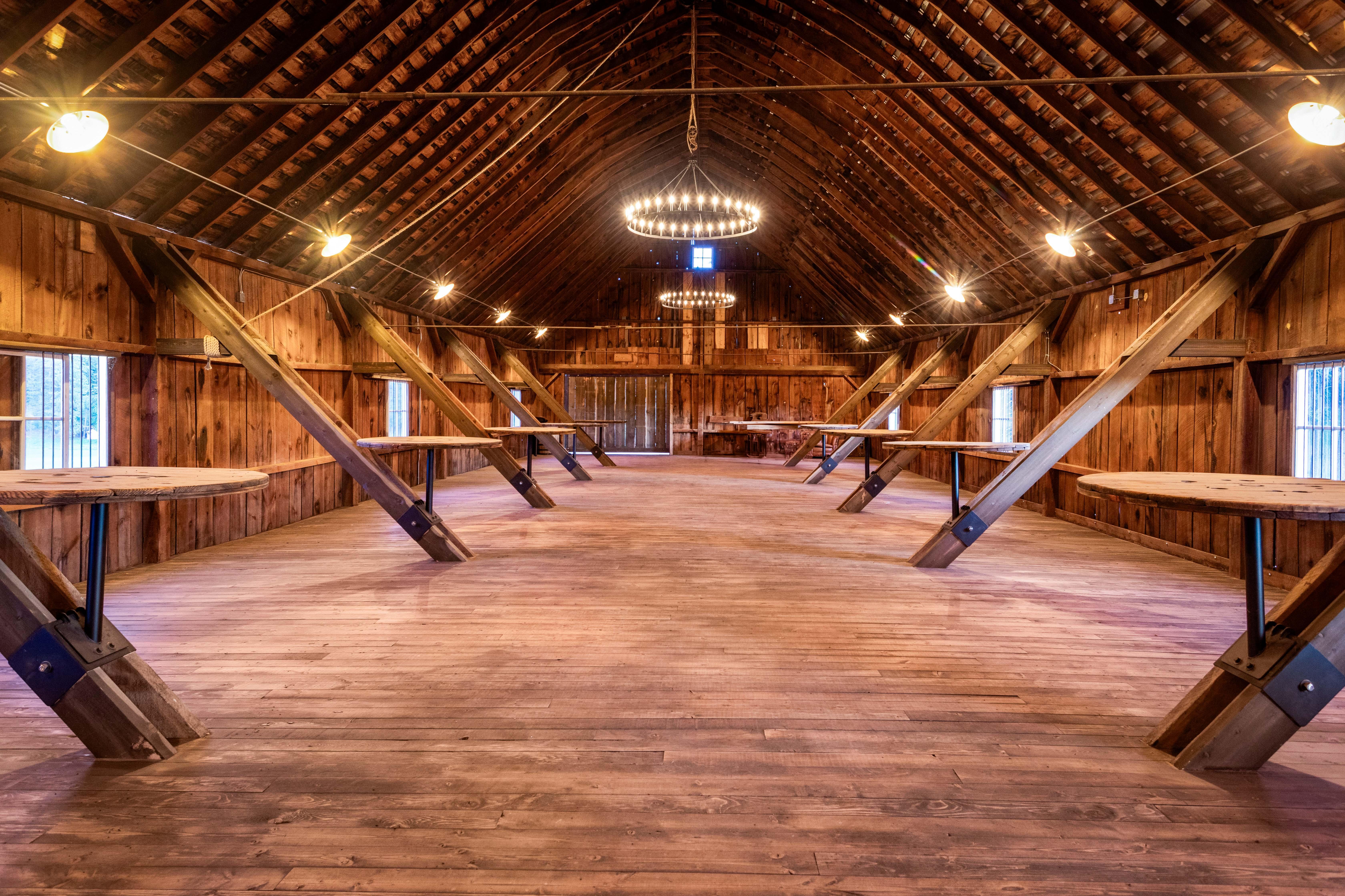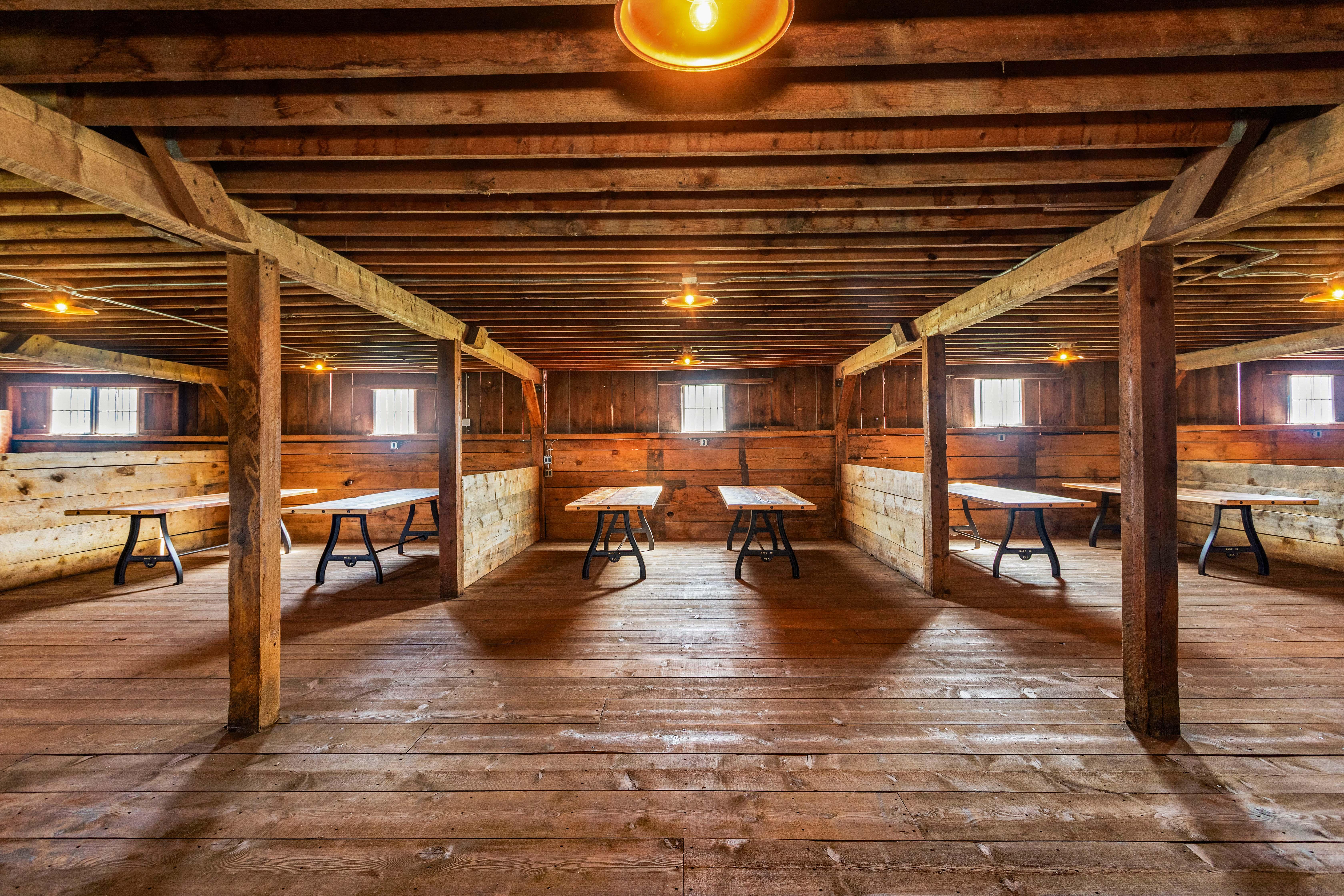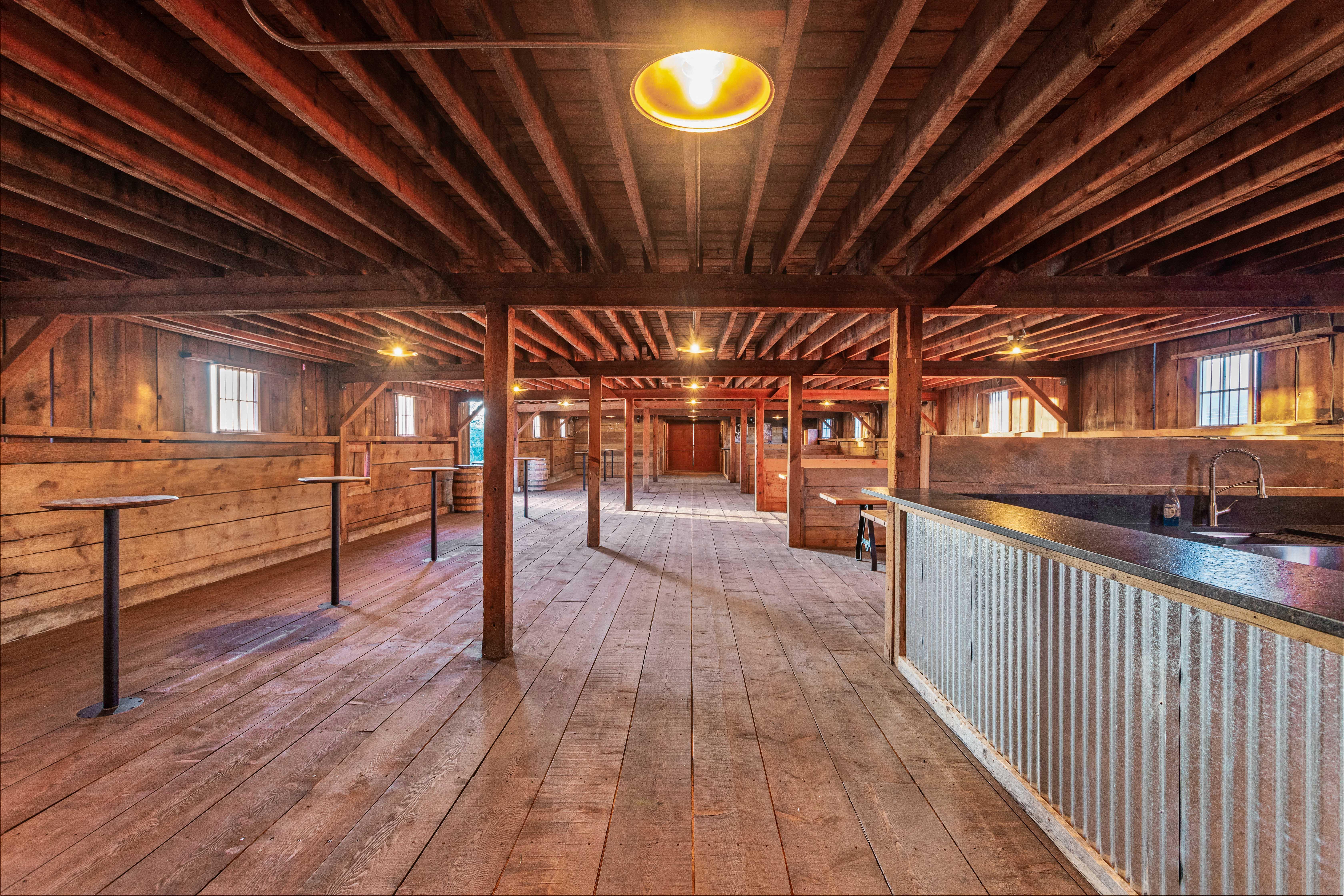 Originally built in 1903, our two-story barn has been carefully restored to preserve its original character. The upstairs, once used to store hay bales, has been transformed into the ultimate celebration space with soaring ceilings, three chandeliers, and panoramic windows framing sweeping views. A large south-facing deck offers fresh air and gathering space. The room includes a movable stage, production-ready hookups on both ends, and 10 custom cocktail tables made from recycled wire spools.