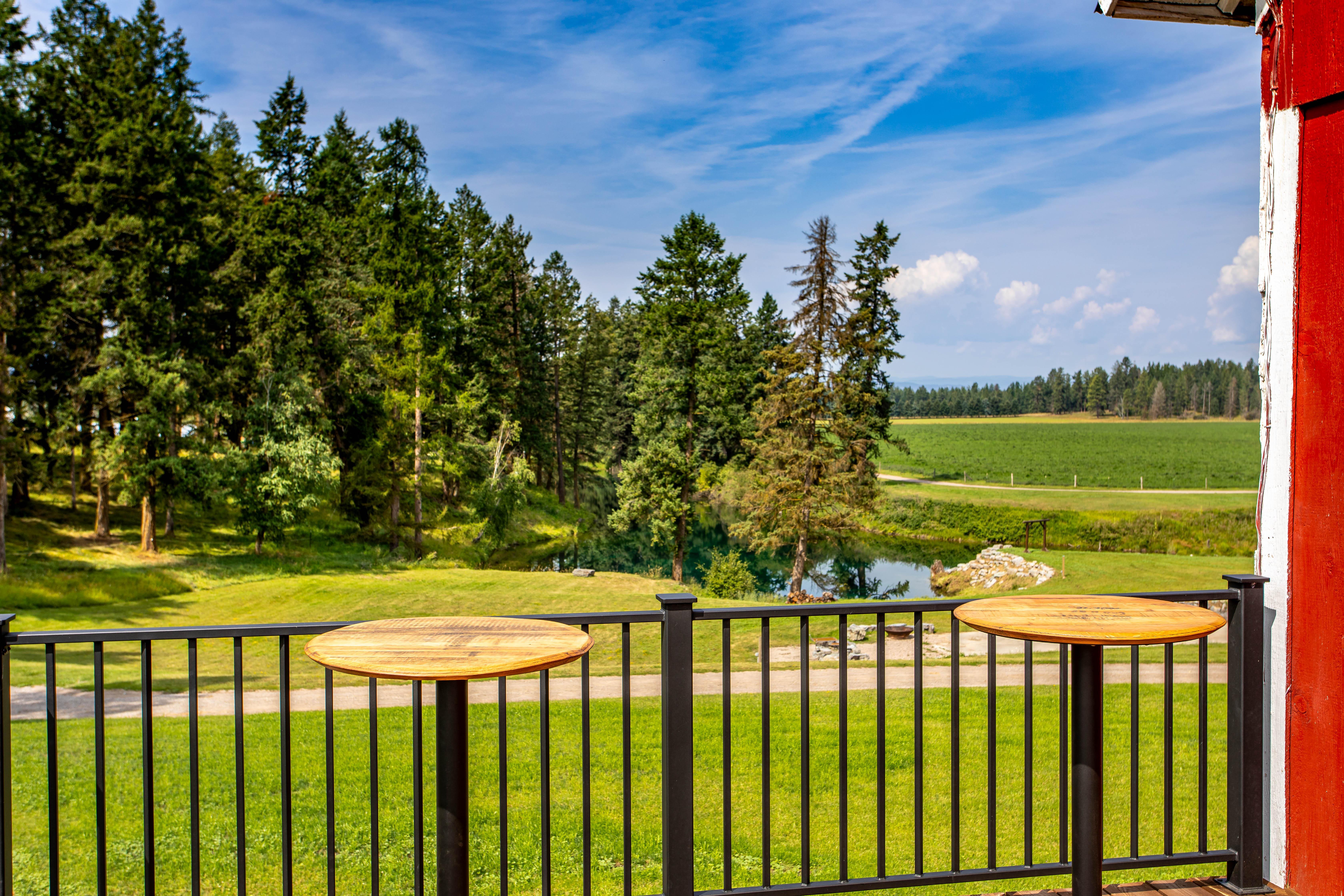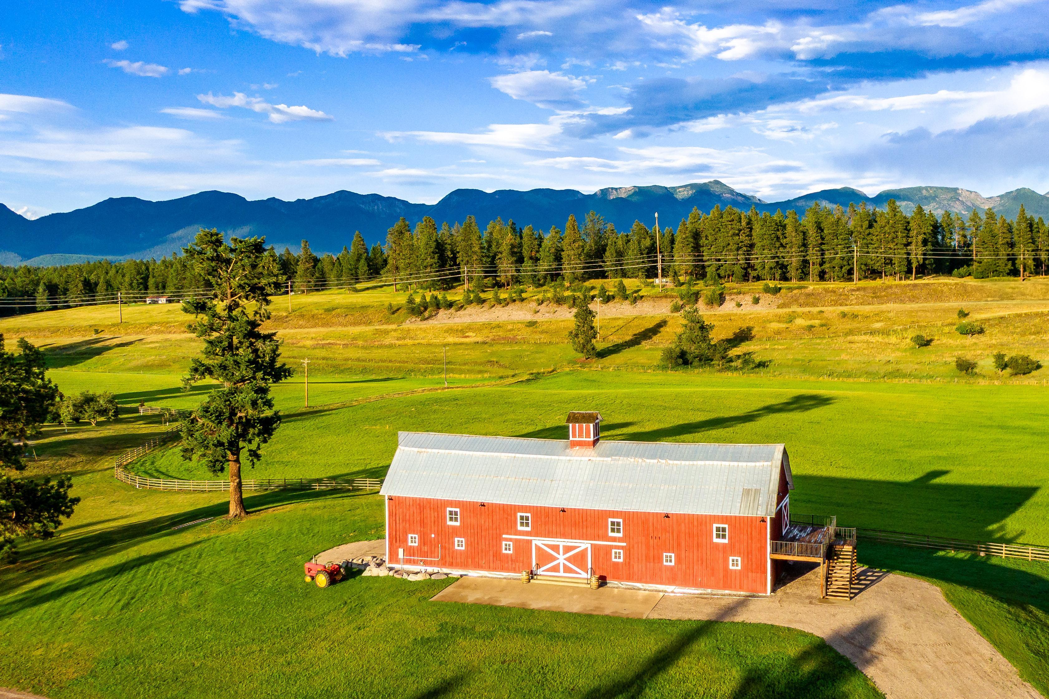 At The Farm, our story is rooted in Montana heritage and thoughtfully reimagined for unforgettable celebrations. Originally built in 1903, our two-story barn has been carefully restored to preserve its rustic character while adapting it for modern gatherings. Original tack rooms have been converted into restrooms, and historic horse stalls now serve as unique bar spaces—honoring the barn’s past in every detail. Set atop a hill on our 500-acre working ranch, where we raise horses, cattle, and forage, the venue offers sweeping 360-degree views of the Flathead Valley. A crystal-clear, spring-fed pond below—brilliantly turquoise year-round—adds a stunning natural backdrop. Located in Bigfork, Montana, just 30 minutes from Glacier National Park, The Farm is perfect for couples seeking an authentic Montana ranch wedding experience.