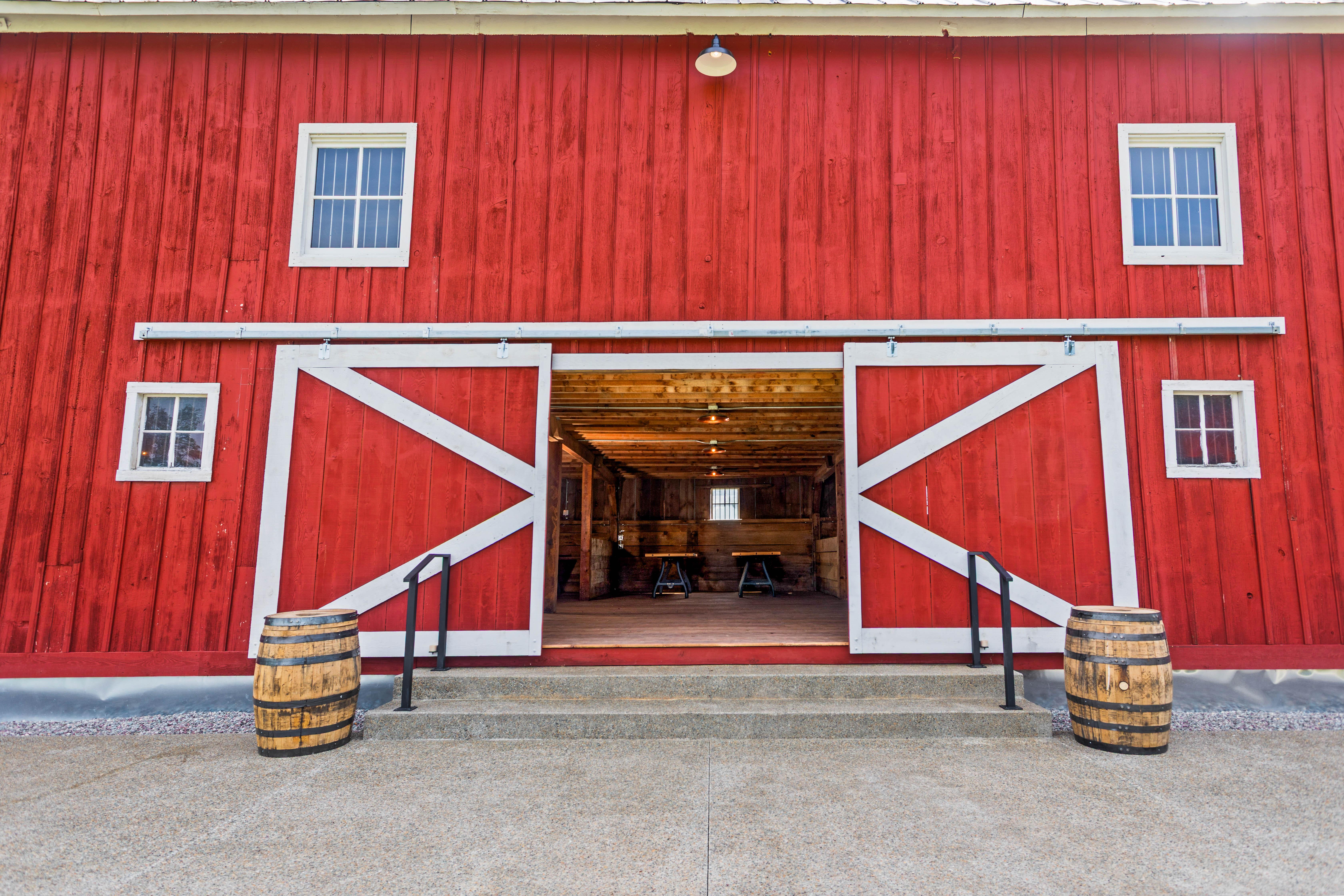 Originally built in 1903, our two-story barn has been thoughtfully restored to preserve its original character while adapting it for modern gatherings. Tack rooms are now restrooms, and horse stalls have been transformed into unique bar spaces. The versatile layout easily transitions from dinner to cocktails to dancing, with removable whiskey barrel tables and power for full bands in the center stall.