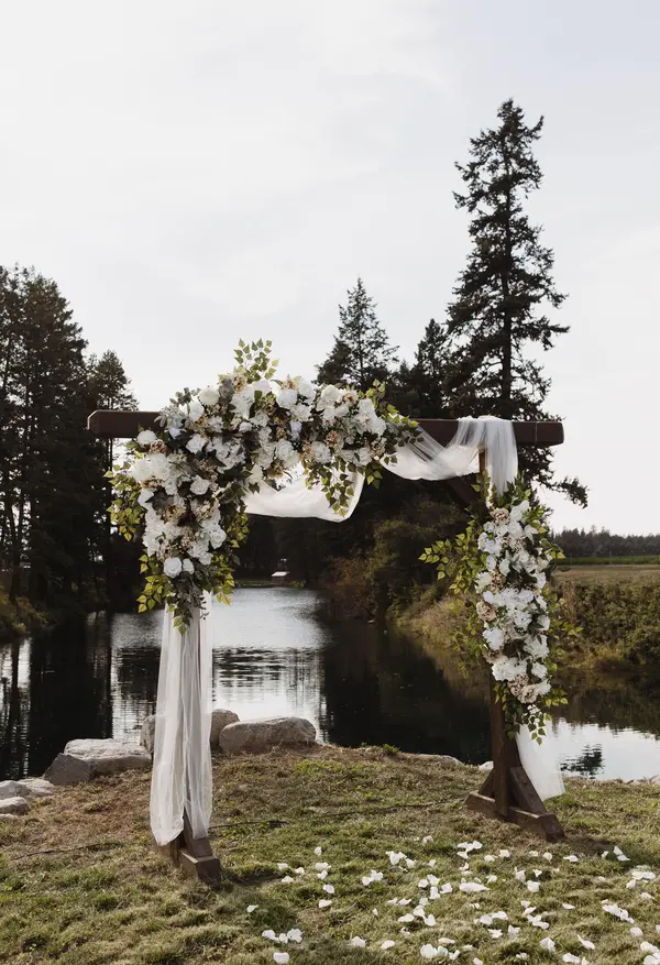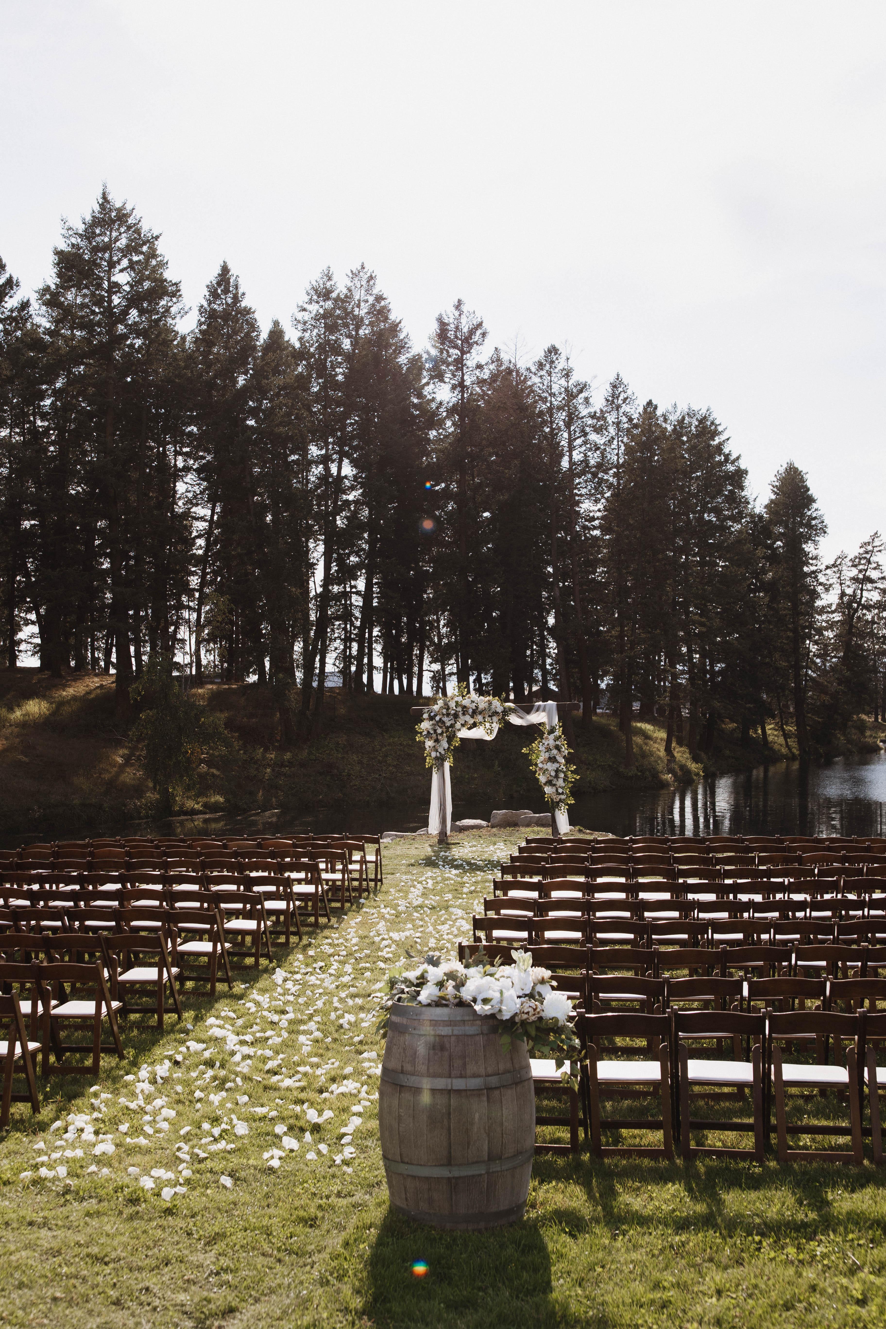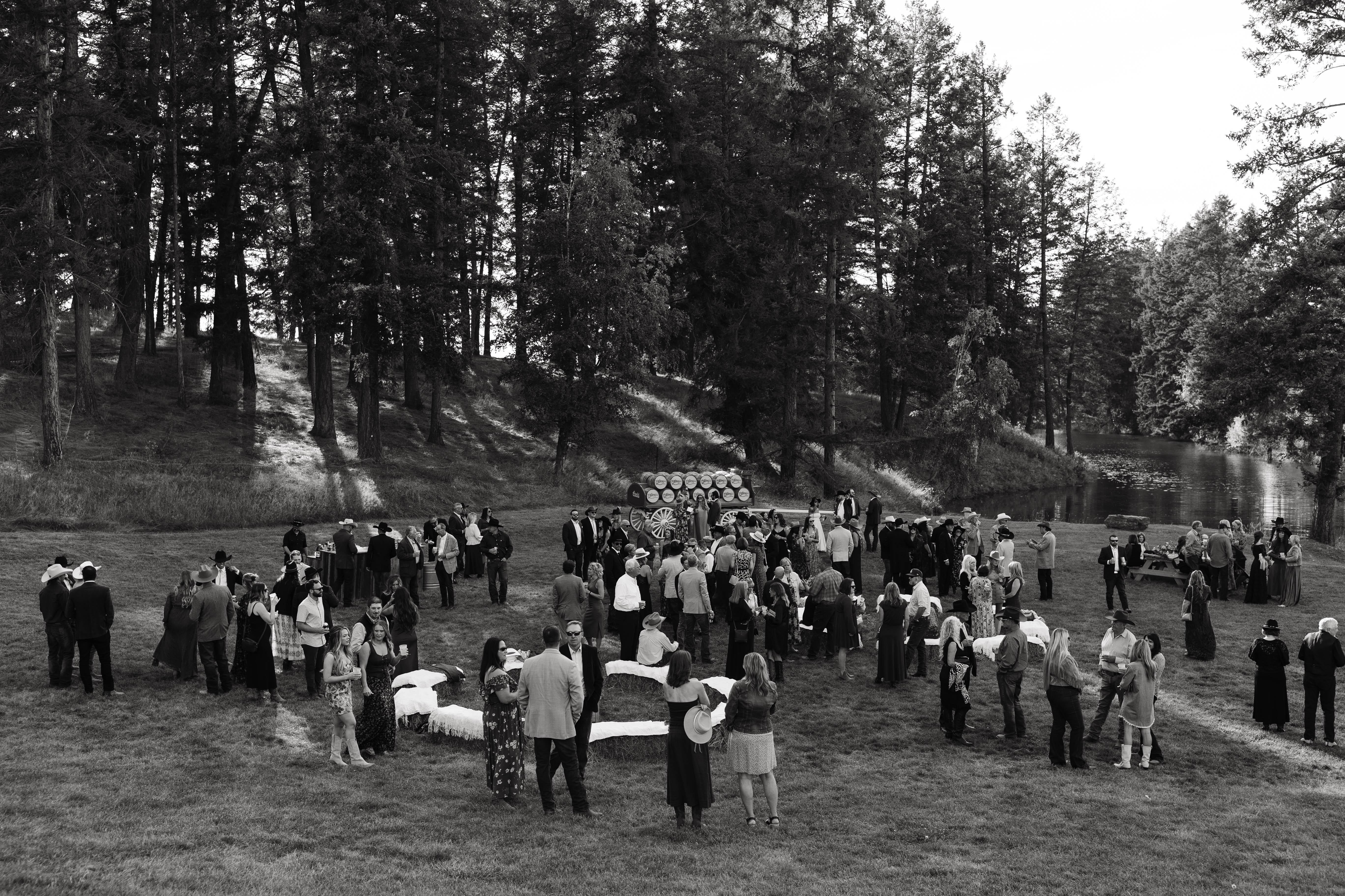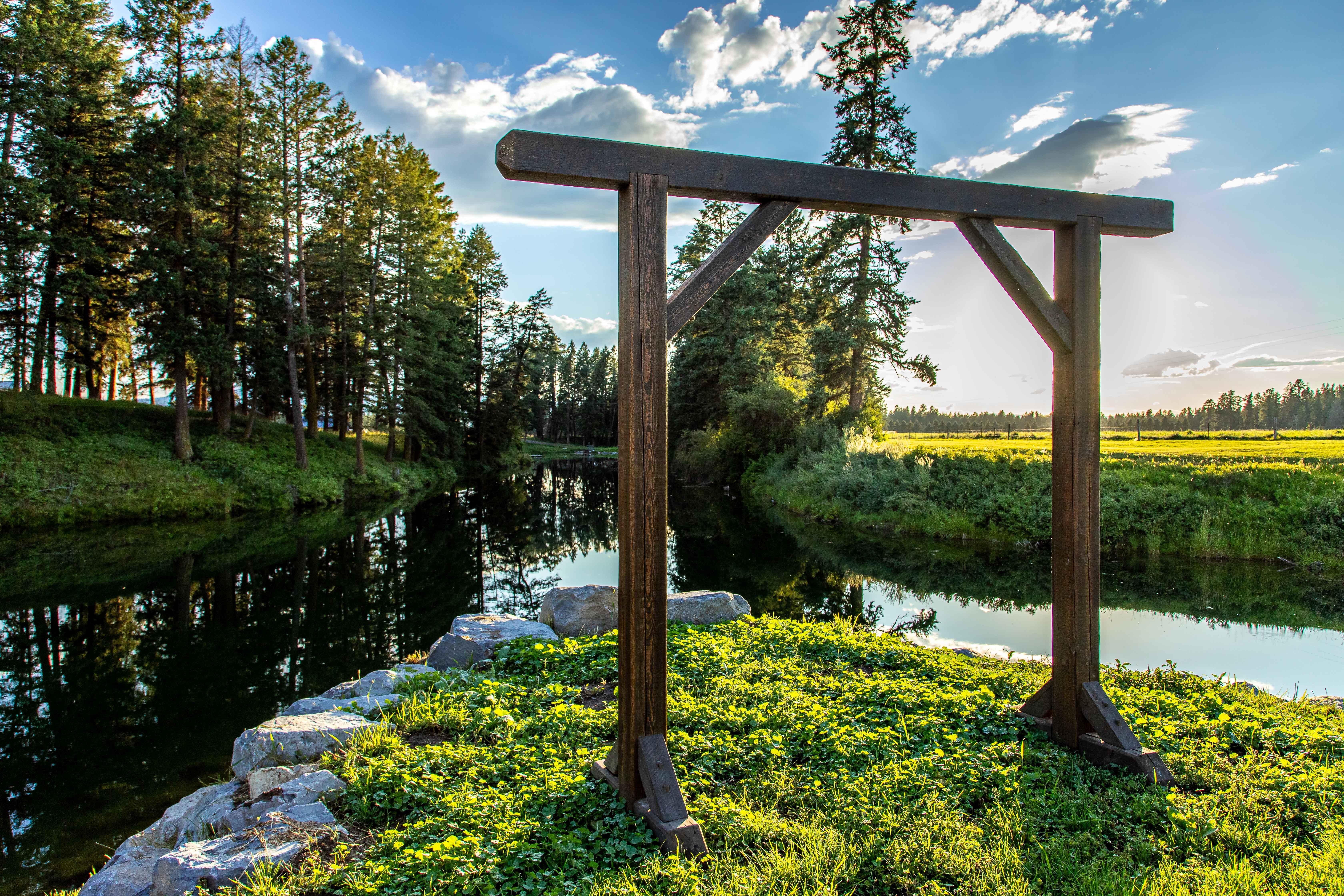 A secluded ceremony point on the edge of a turquoise, spring-fed pond surrounded by working farmland, open skies, and sweeping mountain views. This peaceful setting offers a breathtaking Big Sky sunset backdrop and comfortably seats up to 300 guests, with space for more. A custom large wood arch, built from reclaimed wood from the original 1903 barn, frames the ceremony.