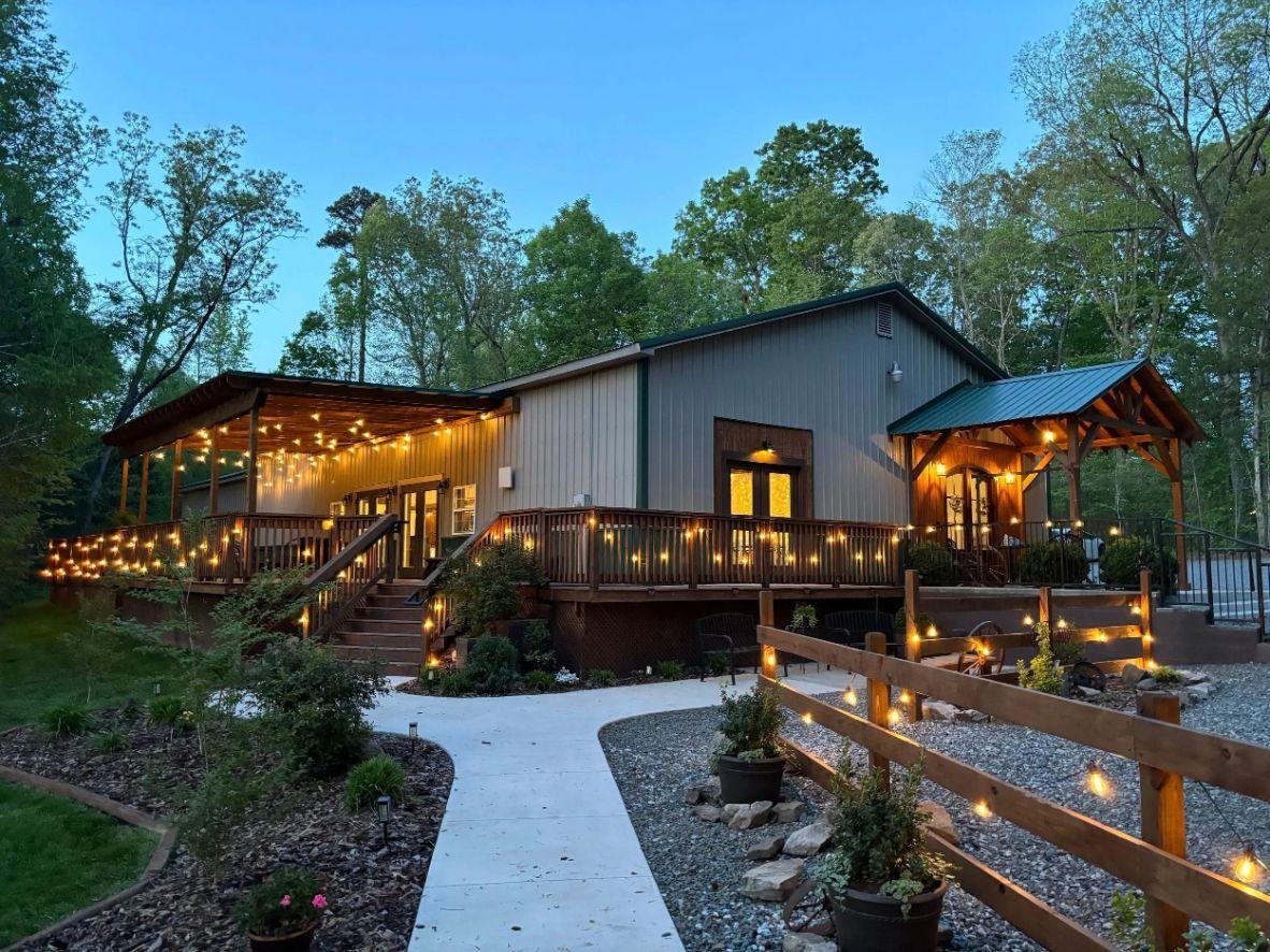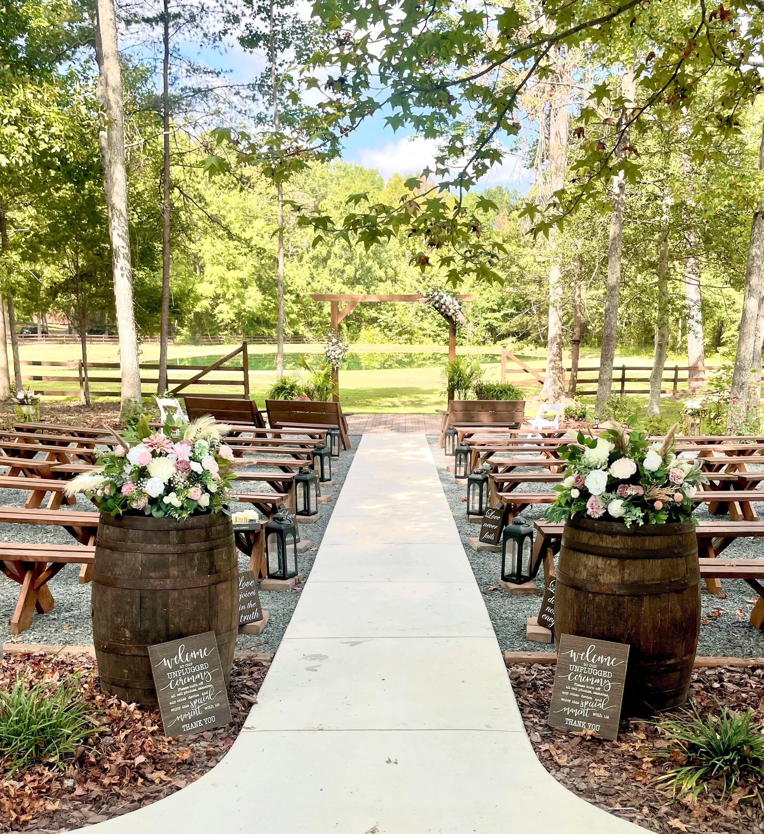 The Garrison Venue is a premier outdoor wedding venue and event center in the heart of Rowan County. The outdoor wedding ceremony area has beautiful wooden pews for seating, and boasts a picturesque waterfront view. The 30 acres of wooded land offer a rustic setting, and the climate controlled reception area provides all the modern luxuries your wedding or event may need. We’re conveniently located just a short drive from downtown Salisbury, NC and Interstate-85. At The Garrison, you can relax on a wraparound porch that overlooks a charming pond, or join the event in our beautifully designed indoor reception area. You will find that our venue offers a rich and warm atmosphere, perfect for weddings and receptions, everyday events, and even corporate business retreats.