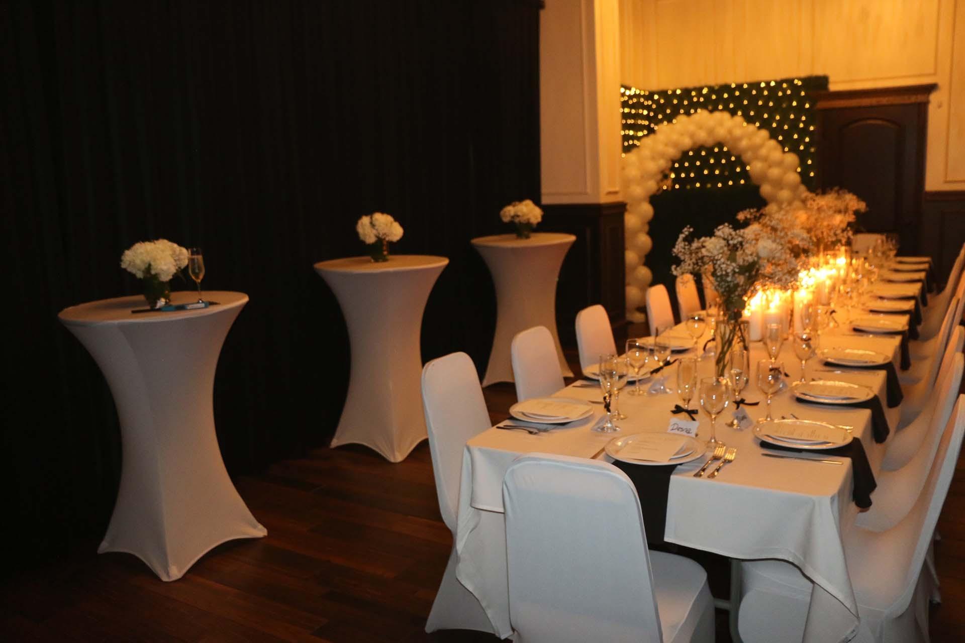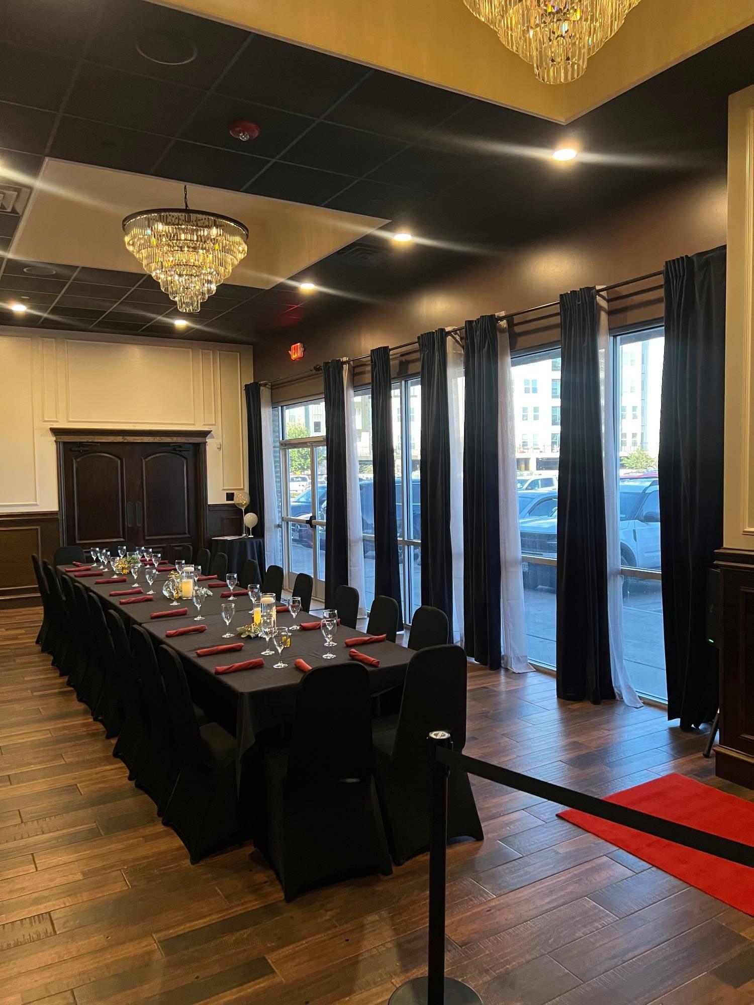 Embodying a mood of modern "after-hours" sophistication, the Onyx Lounge & Gallery Suite is designed for high-impact social events and corporate galas. The space is anchored by rich, dark wood flooring and contrasting white paneled walls, creating a crisp, architectural backdrop. Dramatic black velvet floor-to-ceiling drapery adds a layer of theatrical luxury, while tiered crystal chandeliers provide a warm, ambient glow.