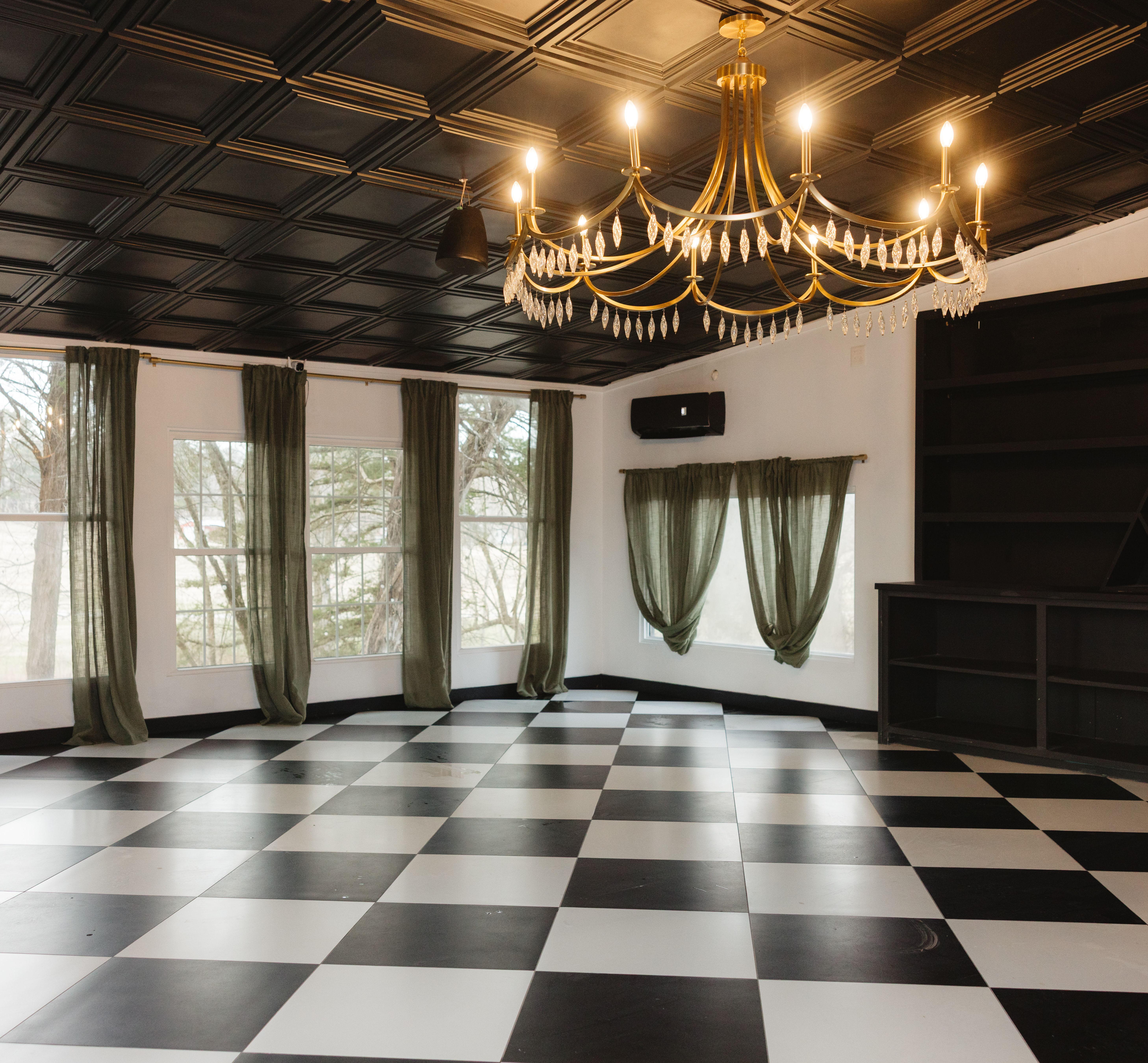 The Monochromatic Ballroom is a masterclass in "vintage-meets-modern" design, offering a bold and unforgettable setting for your celebration. The space is defined by its striking black-and-white checkered floor, which creates a rhythmic, high-contrast energy perfect for a stylish dance floor or an elegant banquet. A dramatic, dark coffered ceiling adds architectural depth, beautifully offset by a large, glittering crystal chandelier that serves as the room’s luxurious centerpiece. Framed by expansive windows and softened by sage green drapery, this ballroom offers a sophisticated, "Old Hollywood" aesthetic that feels both curated and timeless.