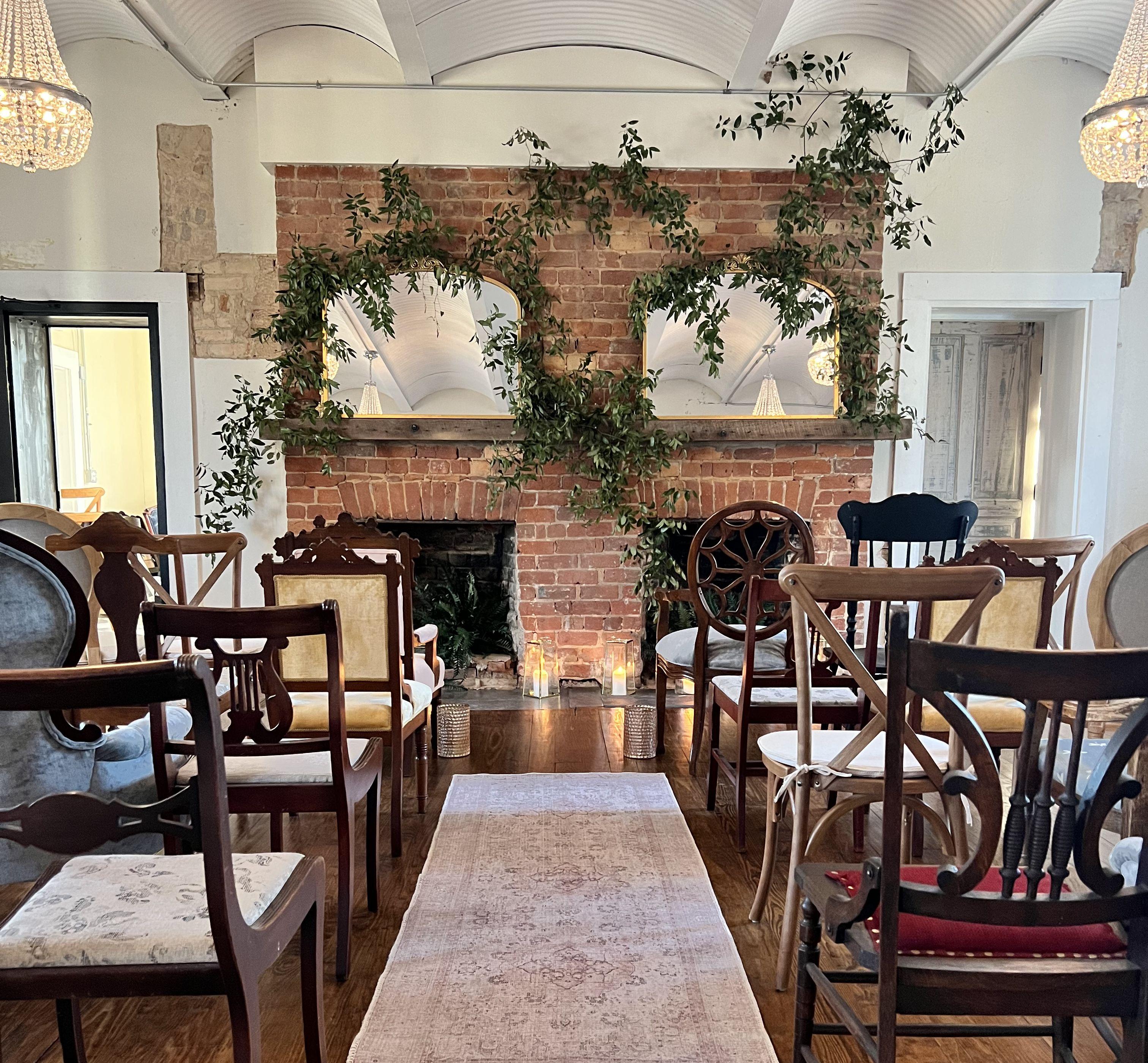 Step into our enchanting upstairs ballroom, showcasing exposed brick walls and remnants of its past as a historic cell block, complete with the main cell door. Adorned with a majestic Victorian fireplace and elegant chandeliers, it exudes a unique blend of history and elegance.
