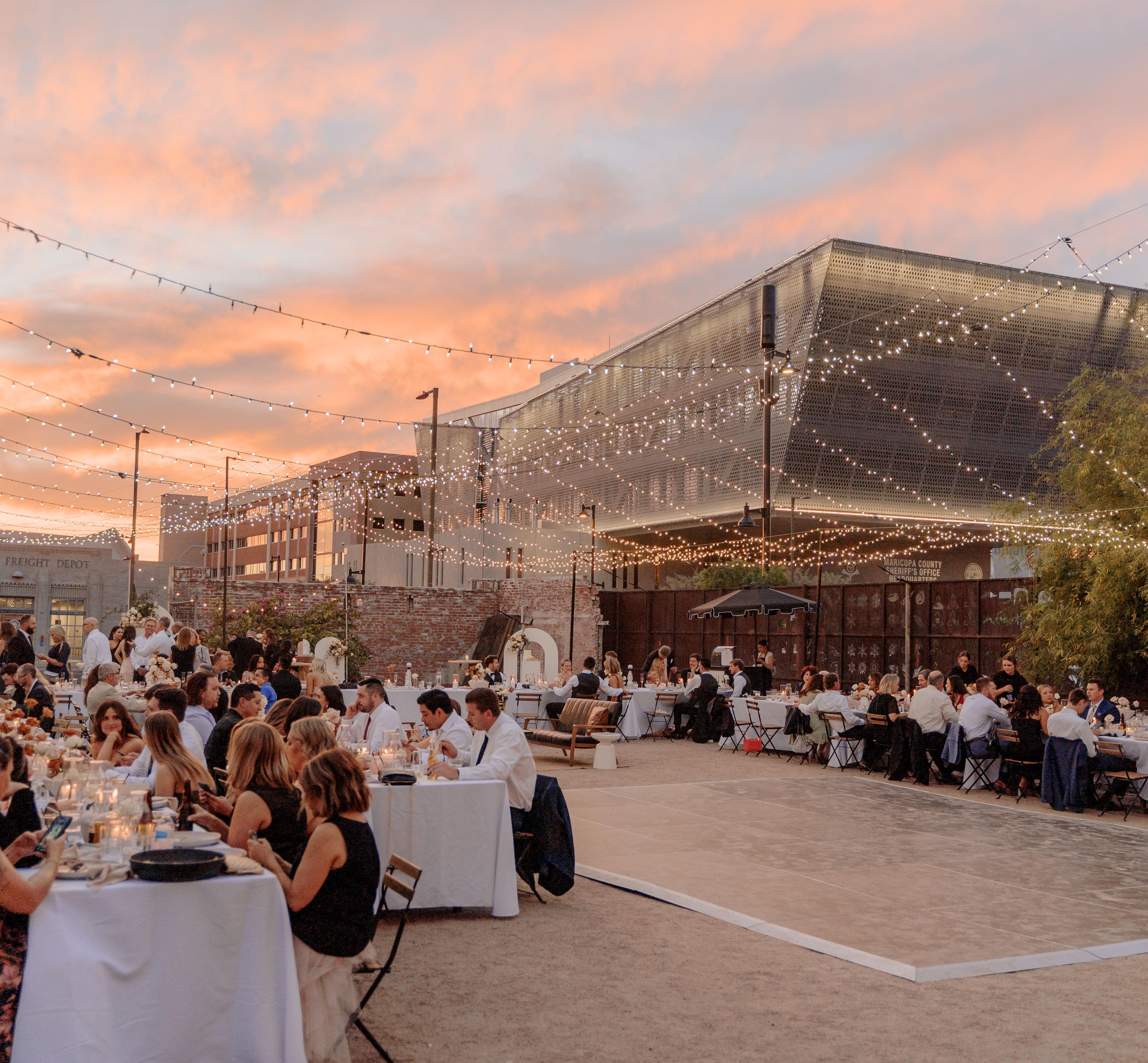Anchored by a striking, open-air cathedral room, this industrial space is a standout venue located in the historic warehouse district of downtown Phoenix. Its three main spaces, and additional outdoor lot, create a fluid balance between indoor and outdoor settings, while its collection of stunning aesthetic features offers opportunities for eye-catching backdrops — from its brilliant white walls to its impressive concrete columns to its show-stopping sunset mural. Celebrate late, because this venue has no sound curfew.