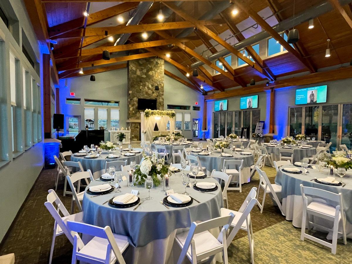 Nestled in the picturesque landscape of Loudoun County, Virginia, The Lodge at Hanson Park offers a breathtaking, nature-inspired setting for your wedding journey. Overlooking a tranquil, shimmering pond, our venue provides a serene and romantic oasis that feels worlds away, yet remains wonderfully accessible for you and your loved ones. Inside, the lodge seamlessly blends authentic rustic charm with timeless elegance. Soaring vaulted ceilings and magnificent exposed wooden beams create a grand, airy atmosphere for your celebration. At the heart of the room, a stunning floor-to-ceiling fireplace serves as a spectacular focal point, casting a warm, celebratory glow over your reception dinner and providing a picturesque backdrop for your wedding portraits.