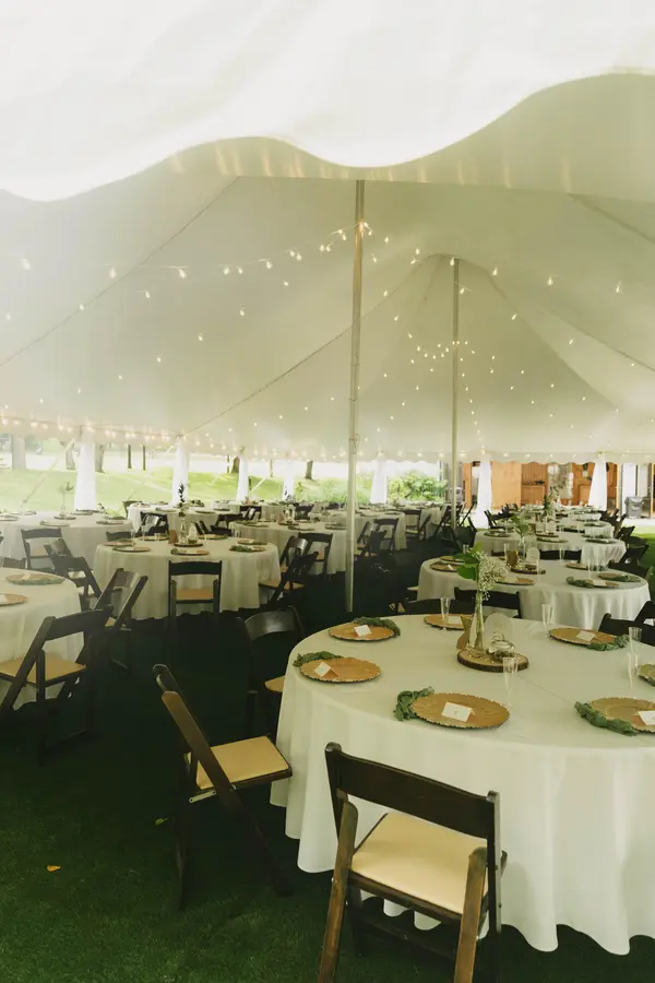 Attached to our party barn, this high peak canopy tent allows for comfortable events in excess of 200