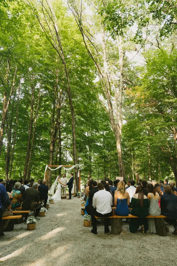 Surrounded on all sides by water, this peninsula ceremony site sits in gorgeous forest canopy complimented preserve sourced seating.