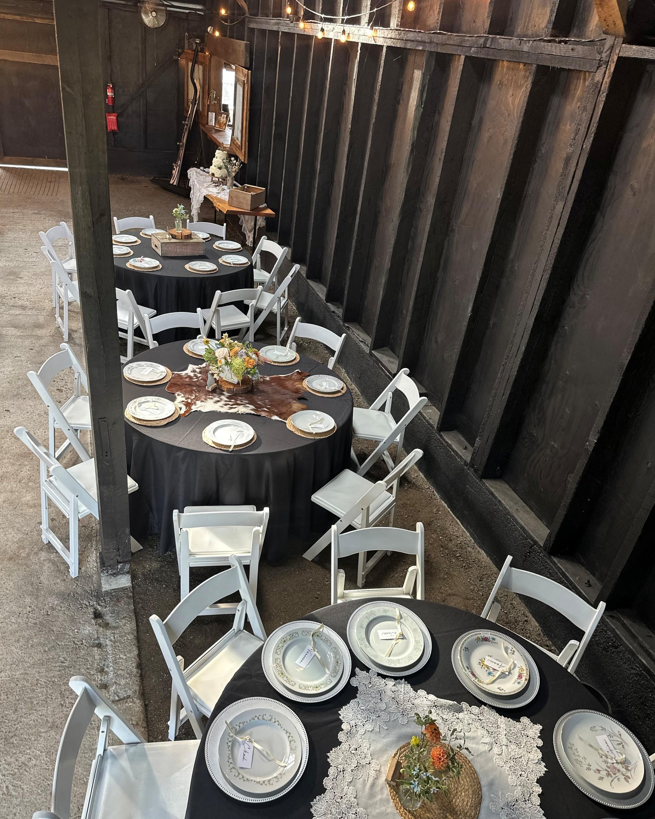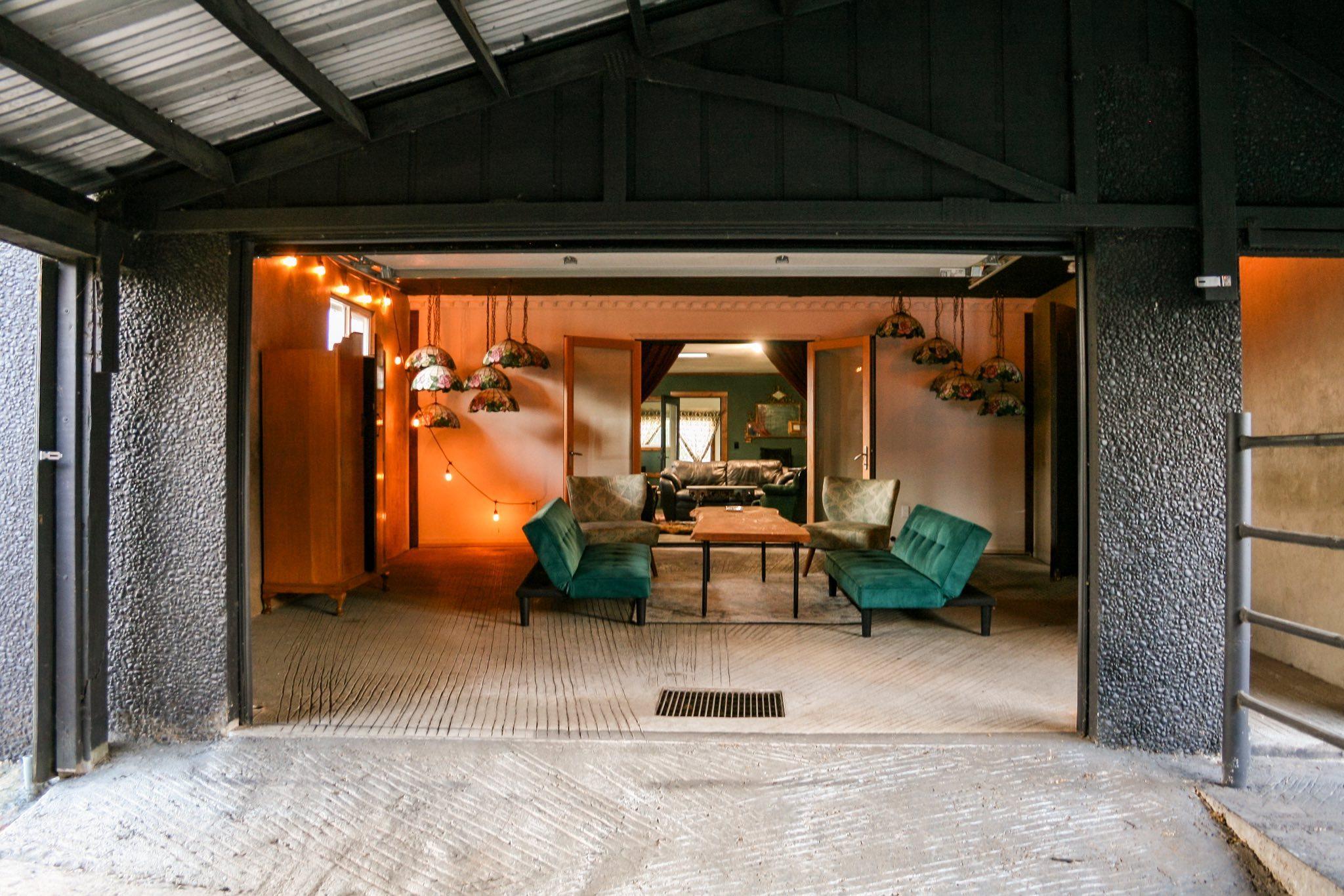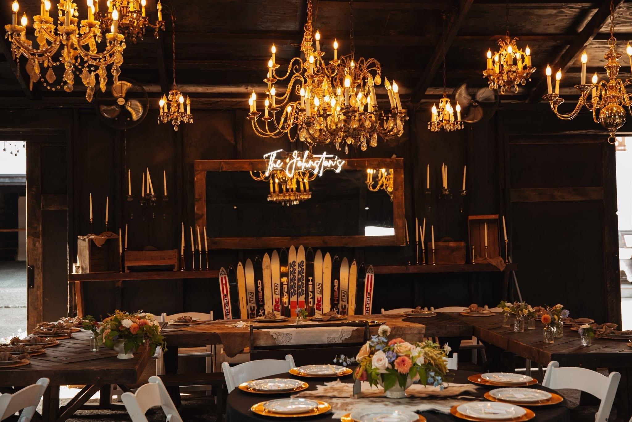 -Chandeliers -Sliding Barn Doors -Space heaters for colder weather -Bar access -French doors