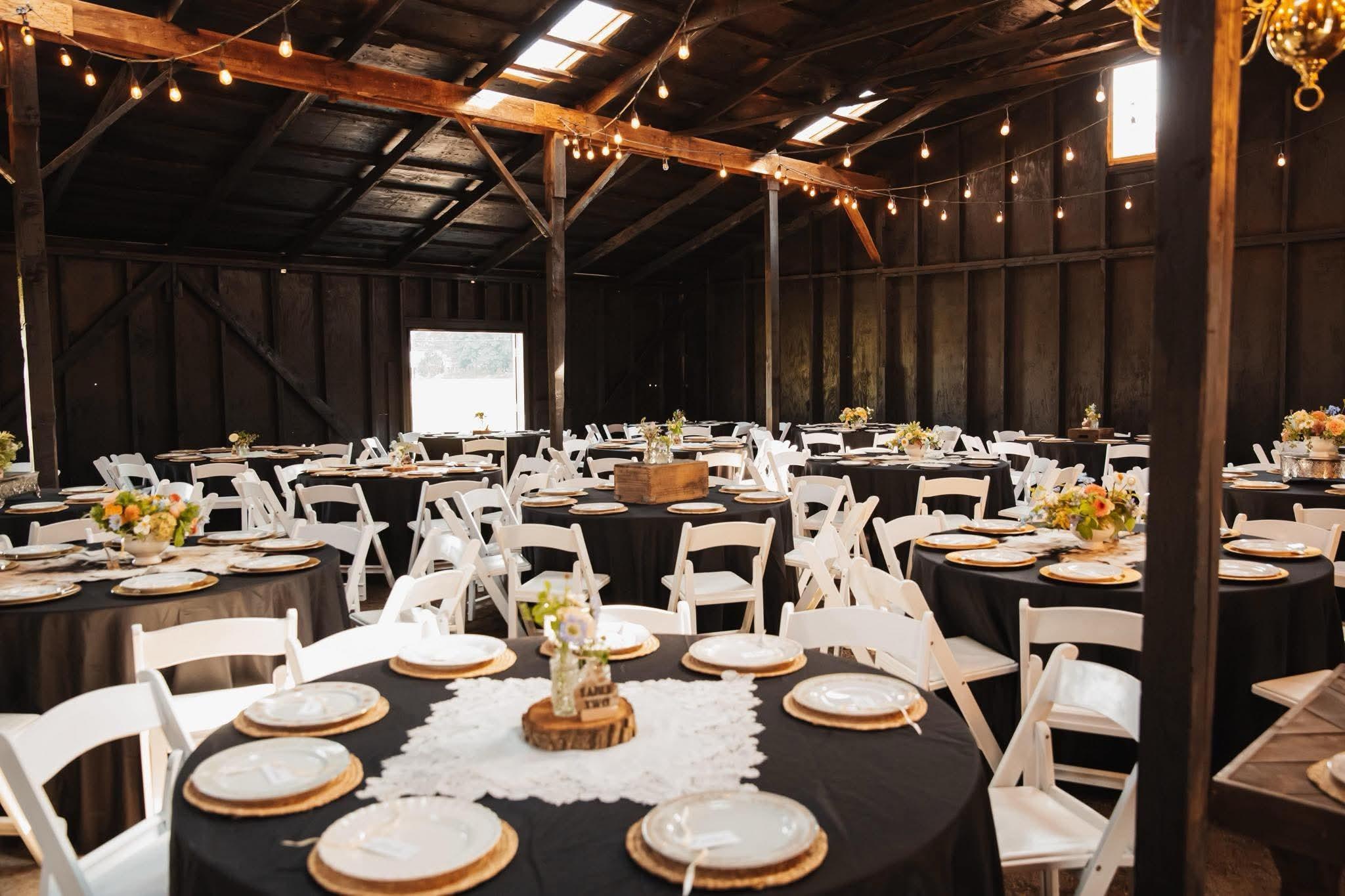 The covered reception pavilion is an ideal space for the summer weddings with sliding barn doors, french doors, and fans for that open air feel.