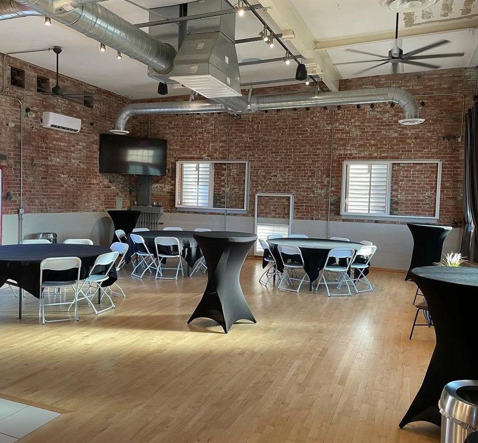 Indoor and outdoor venue that can comfortably seat up to 60 guests inside at once, or up to 75-80 when spread between inside and outside spaces. We offer two 70" television screens for slideshows and a PA system that has play inside and outside on the patio. We offer heaters in the winter and fans in the summer on our patio for guests to stay comfortable and have an ice chest on the patio ready to be filled. Our storage space inside houses the sink, ice machine, fridge and prep station for those who bring in their own food and drink. We welcome bands and Dj's inside the space and welcome all outside vendors. Our space includes 10 tables, up to 60 chairs and your choice of black or white linens. And our team set's it all up and breaks it all down for you.
