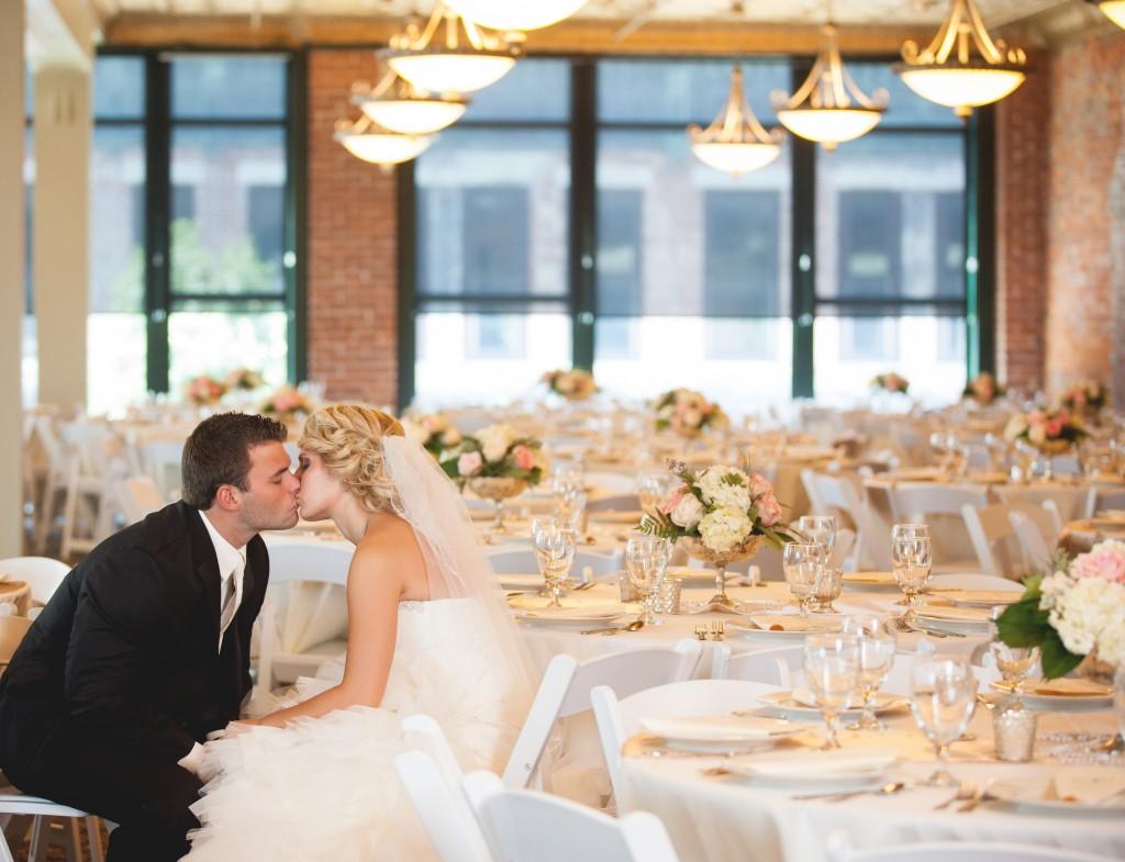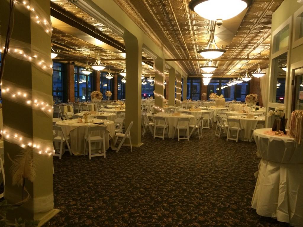 The main event center is a grand, open-concept space characterized by its timeless urban aesthetic. Historic brick pillars and high ceilings create a sense of scale and drama, while the neutral palette allows for endless decor possibilities. The room is designed for a seamless flow, allowing couples to transition from a romantic ceremony to a high-energy dance floor in one cohesive setting. For added ambiance, customizable LED uplighting highlights the architectural textures of the building. The venue also features a full stage for entertainment and a caterer-friendly area to support your culinary team.