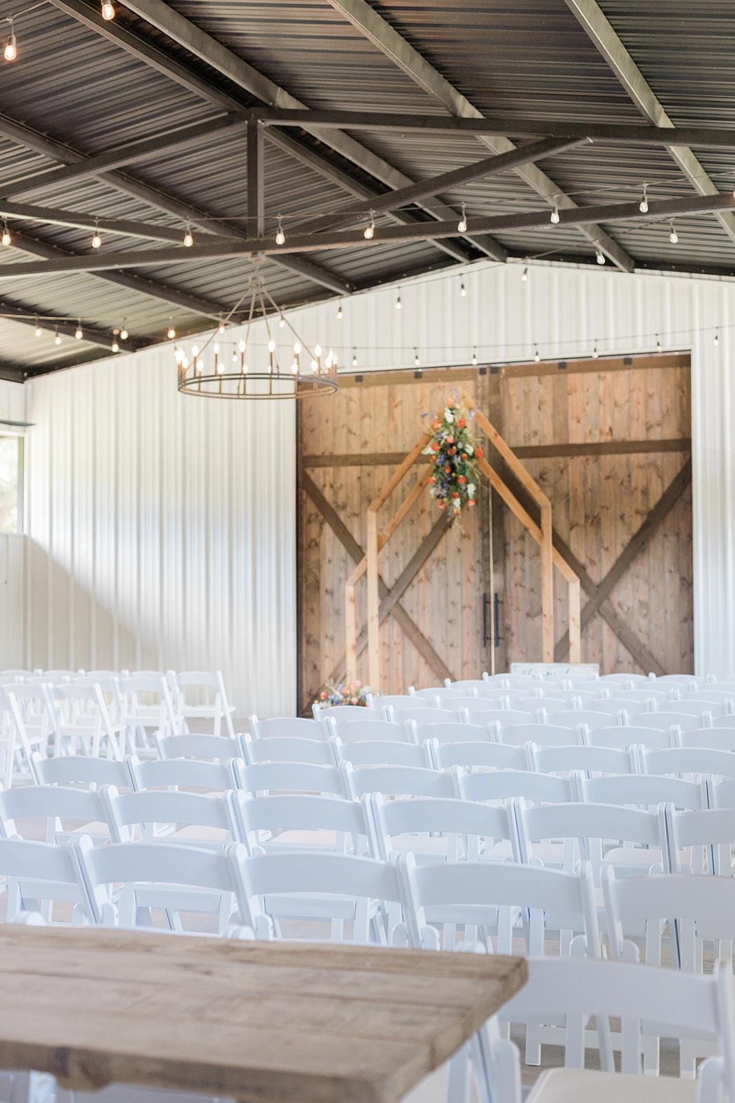 The focal point of The Outdoor are the grand wooden barn doors. These massive barn doors stand over 14’ tall and are the perfect setting for your ceremony. The white wedding chairs arranged in neat rows, offer an elegant contrast against the rustic backdrop, creating a visually stunning scene. Soft, warm lighting fixtures are strategically placed, casting a romantic glow as the sun sets. Twinkling string lights are draped overhead, creating a magical atmosphere under the starry night sky.