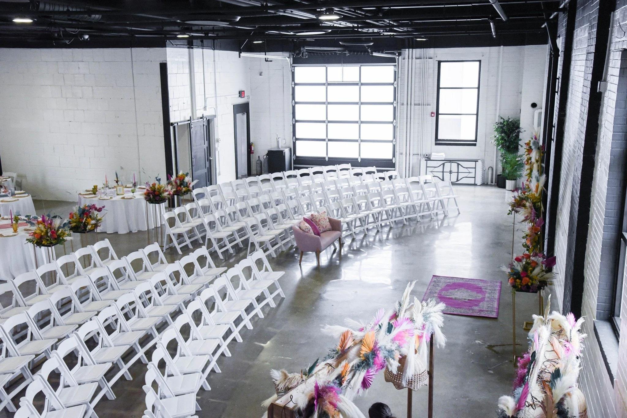 The Main Hall (often referred to simply as "The Shop") is the heart of the venue. It is a roughly 3,500-square-foot industrial space that serves as the primary location for wedding dinners, large receptions, and indoor ceremonies. Includes 22 6-foot round tables and beautiful cross-back stacking chairs.