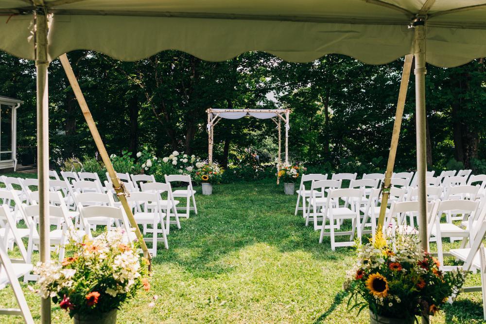 Our wedding lawn is a serene outdoor space surrounded by vibrant flower gardens, offering scenic views of the Little River. Perfect for ceremonies, it provides a beautiful, intimate backdrop where your celebration feels personal, memorable, and framed by the natural charm of Stowe.