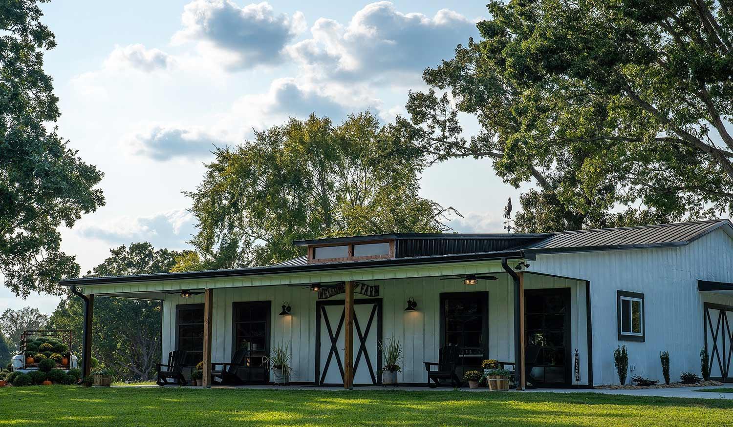 The Union Exchange is a gorgeous wedding venue and farm located in Monroe, NC. This stunning 100-year-old property expands over 54 acres of NC farm land encompassing an indigenous pine tree forest and 3.5 acres of scenic ponds. Featuring an abundance of restored historic structures and with a capacity of 150 guests, you are sure to find the perfect locale to say "I do." Gather your loved ones for your picturesque ceremony on the sprawling event lawn with luminous fountain views or in the magical pine tree forest. As the party atmosphere fills the air, retreat to one of our reception barns that combine vintage craftsmanship and elegant design! Dance the night away under the twinkling bistro lights while enjoying the beauty of your countryside celebration. As the festivities conclude, cozy up in our onsite sleeping accommodations including two private houses and two glamping cabins. The Browns are excited to share their land and create new memories with you and your family!