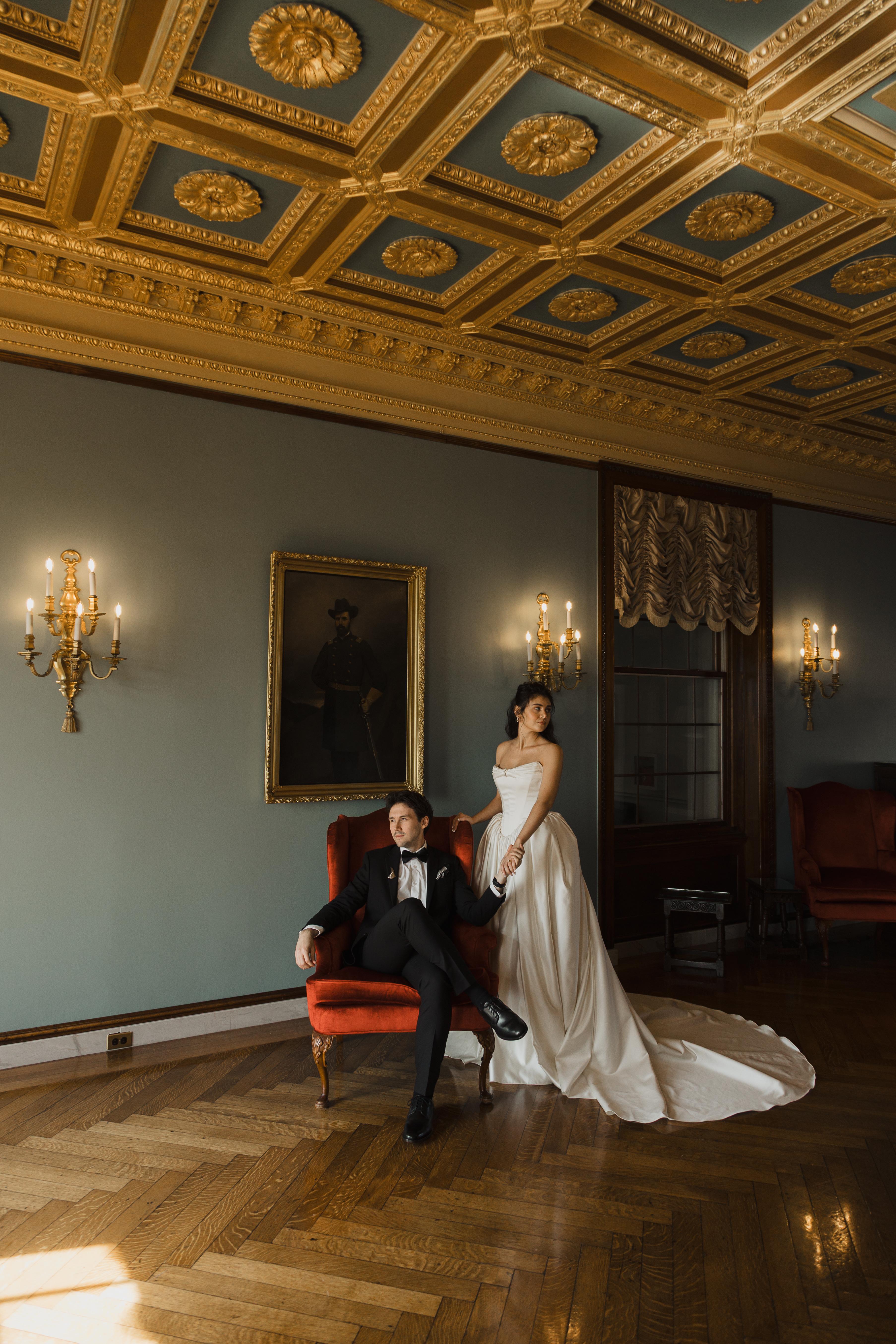 The Historic Alger House is available for intimate weddings of up to 70 guests or can be rented as an extension for cocktail hour. Within the space lie three enchanting, seamlessly connected rooms, the Reception Room, Dining Room, and Library; each adorned with hand carved moldings, intricate ceiling artwork, grand stone fireplaces, and elegant French doors that open to the sweeping back lawn overlooking Lake St. Clair.