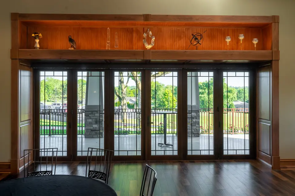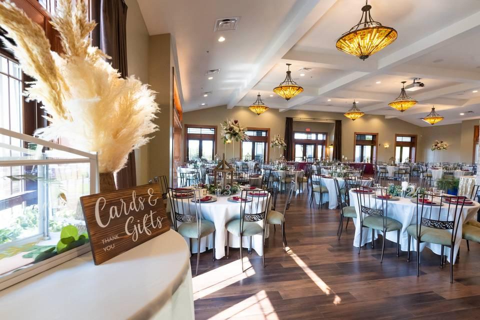 Tiger Pointe Country Club offers the Tiger Ballroom for celebrations and is able to accommodate 175 guests. Even larger gatherings can be held with the addition of the outside terraces and porches. Carefully laid out, the terraces and inside ballroom are designed to flow together, encouraging guests to converse and making it simple to organize wedding events in a seamless way. The ballroom’s window walls allow for light to naturally flood the space while affording couples and their guests views of the surrounding terrain. It features a full bar, which is staffed by their professional team, along with a transparent fireplace for a one-of-a-kind and warm touch.