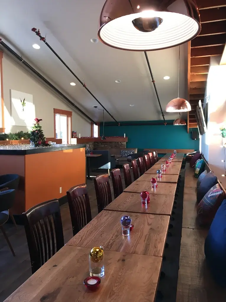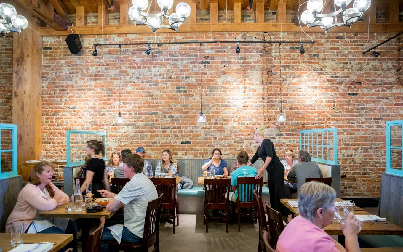 The interior event space at Treeline Kitchen is a masterclass in modern mountain design. Centered around a original bricks walls and a beautifully crafted bar, the room features high ceilings and rustic textures that nod to Leadville's mining history. The layout is versatile and encourages conversation and connection. Whether you are hosting a cocktail party or a full buffet, the warm wood accents and glowing ambiance create a cozy, sophisticated environment.