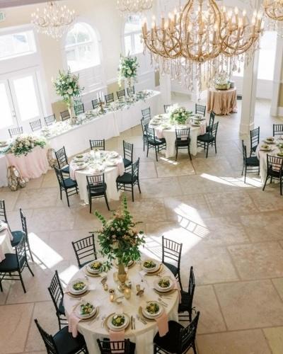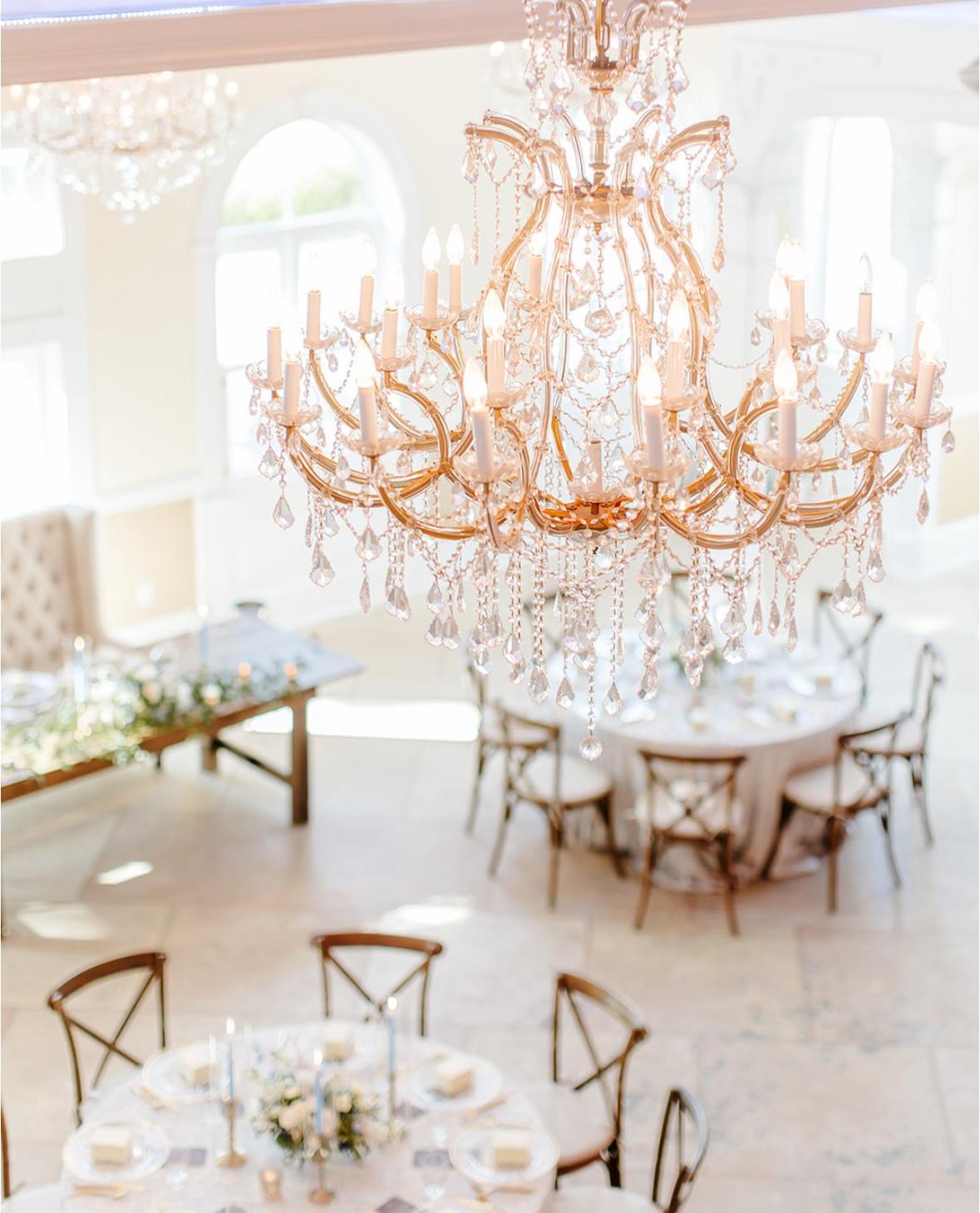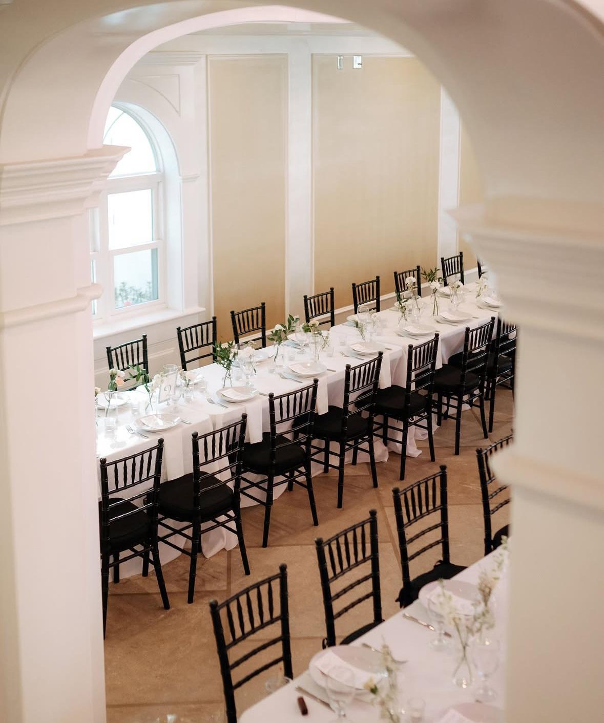 This ballroom exudes classic charm with its grand chandeliers, high ceilings, and large arched windows that flood the space with natural light offering a versatile atmosphere for any celebration or occasion up to 225 guests.