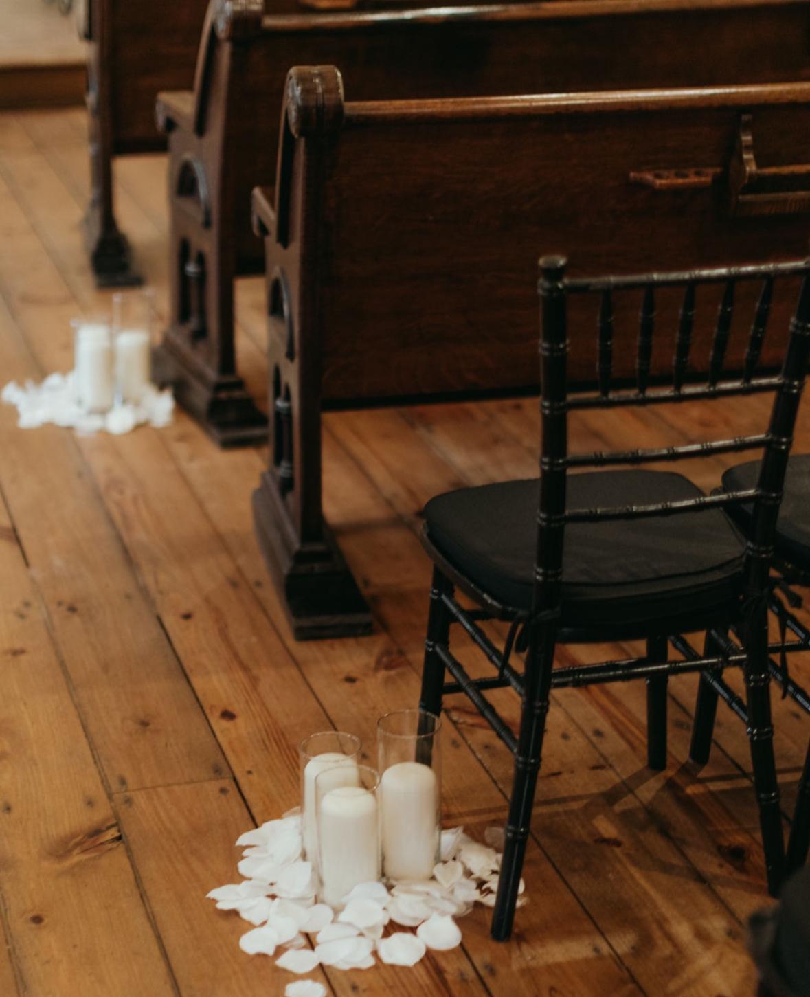 -Dimmers for lighting customization -Sound -Podium -Microphone -Wooden Cross -Black Chiavari Chairs -Wooden Pews
