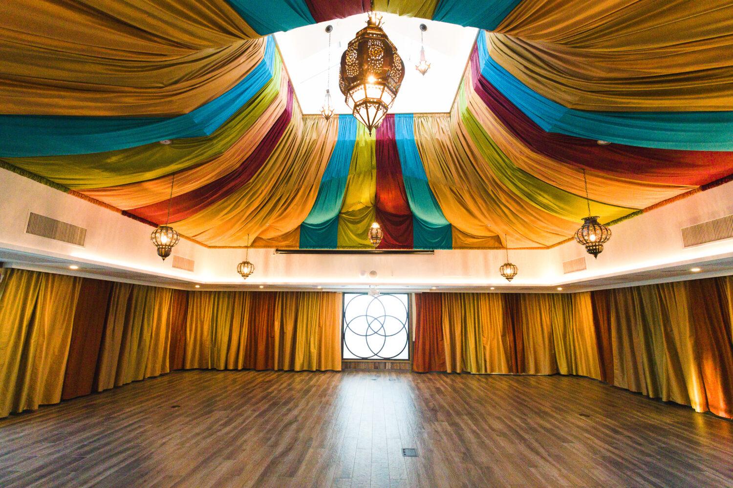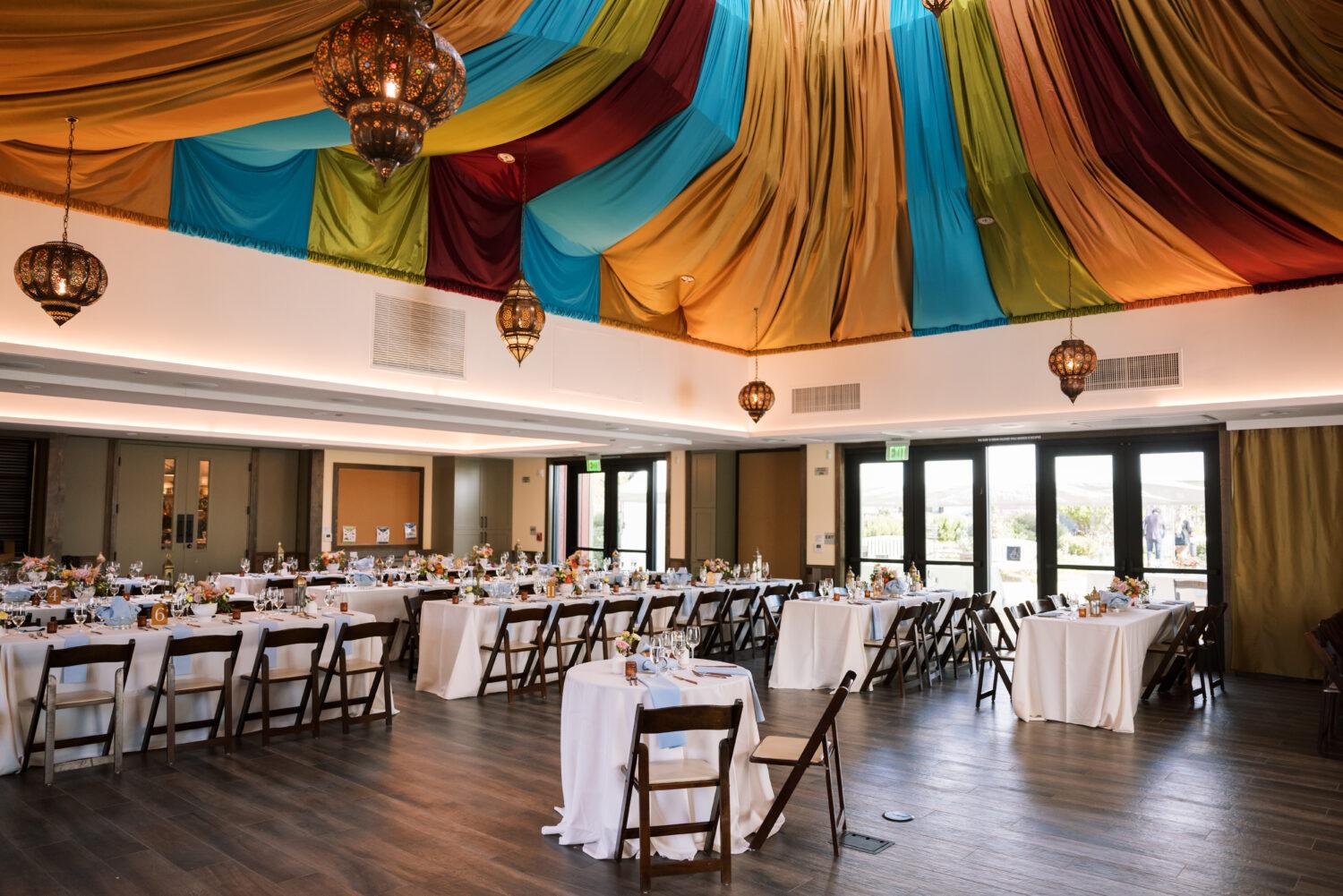 The Community Hall offers a beautiful and expansive open space designed for grand and celebratory events. The interior is immediately festive, warmly accented with vibrant, colorful Moroccan-style fabric and lantern decoration. This flexible hall can easily accommodate large seated receptions or full-capacity ceremonies. It is fully supported by an attached commercial kitchen for seamless catering service. For perfect indoor/outdoor flow, the hall is located adjacent to an open outdoor gathering area, allowing your guests to enjoy the fresh air and unique atmosphere of the farm on your special day.