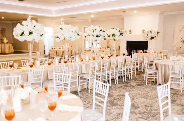 White Chiavari Chairs with Silver Cushions 60" Round Tables (can seat 8) 6' Rectangle Tables Built in Bar Built in Stage Fireplace Bridal Dressing Suite Covered Entrance