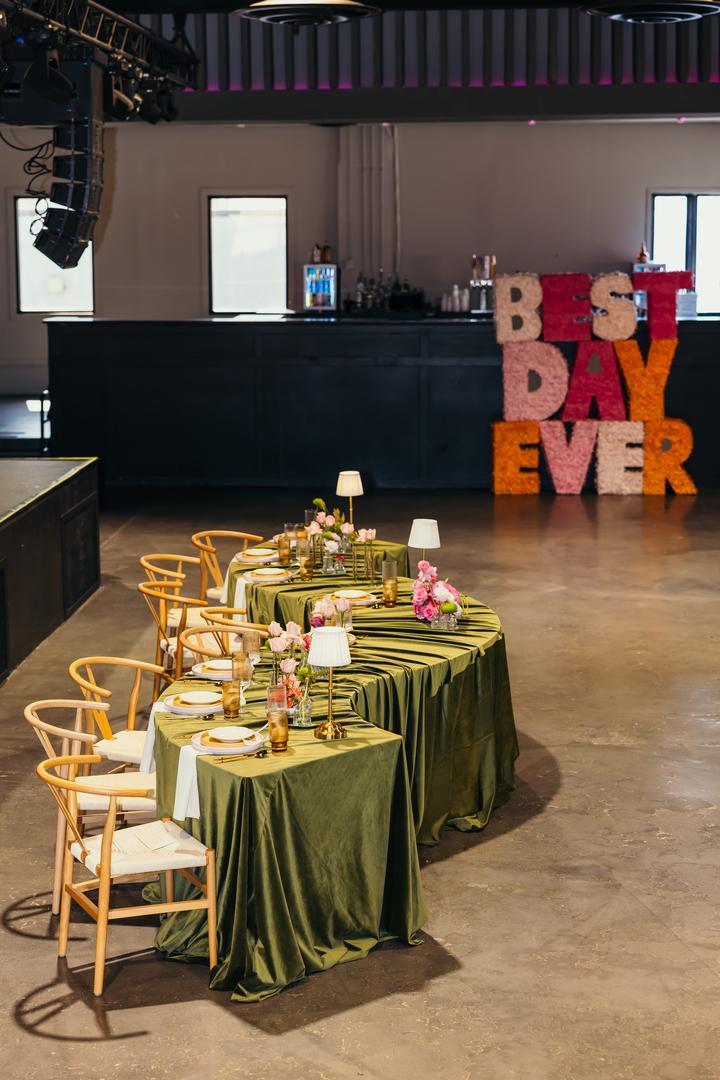 The space feels vibrant and high-energy. The deep, moss-green velvet linens provide a grounding, luxurious weight to the room, while the "Best Day Ever" floral installation in shades of fuchsia and orange adds a punch of retro-pop fun. It’s a venue that doesn't take itself too seriously but still maintains a sharp, editorial edge. With the professional stage lighting and open concrete floor, it feels less like a traditional banquet hall and more like an exclusive after-party at an art loft.