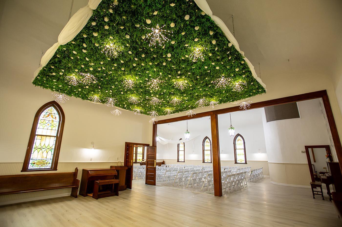 Elegant drapery frames the space, while soft hanging lights intertwined with cascading wisteria cast a warm, ethereal glow throughout the room. A hand-painted floral mural adds a one-of-a-kind, artistic touch, complemented by stunning stained glass windows that fill the space with natural light and timeless beauty. A classic piano completes the setting, offering the perfect opportunity for live music creating an intimate atmosphere—transforming your vows into a truly magical experience.