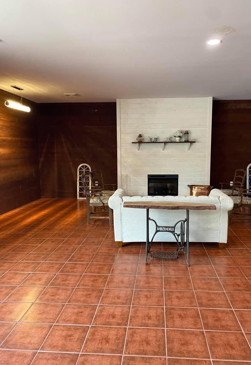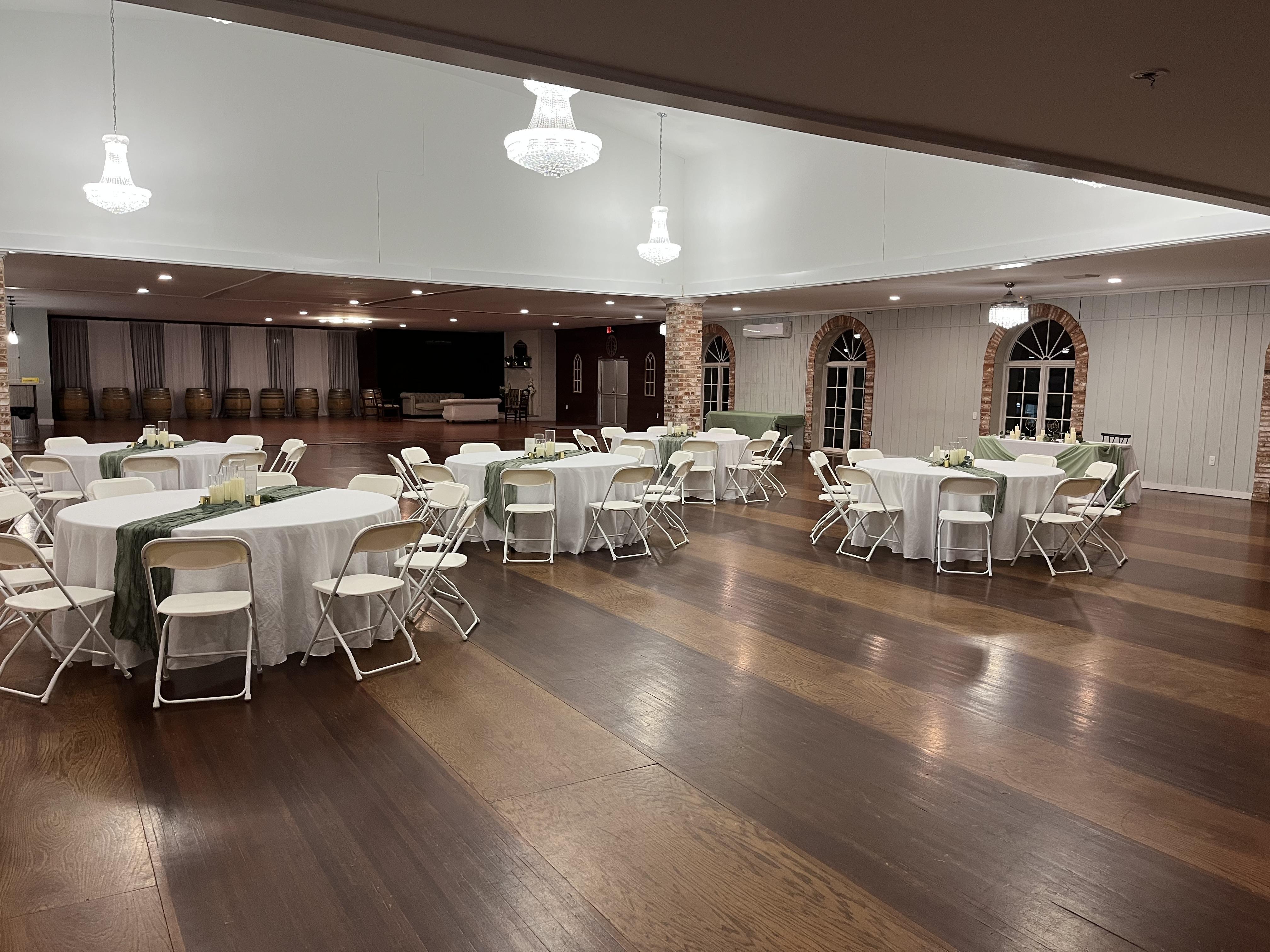 - Table and chairs for up to 300 guests. - High top barrel tables for cocktail hour. - Bar area. - Stage. - Kitchen area. - Bride's Room. - Groom's Room. - Seating area with fireplace.