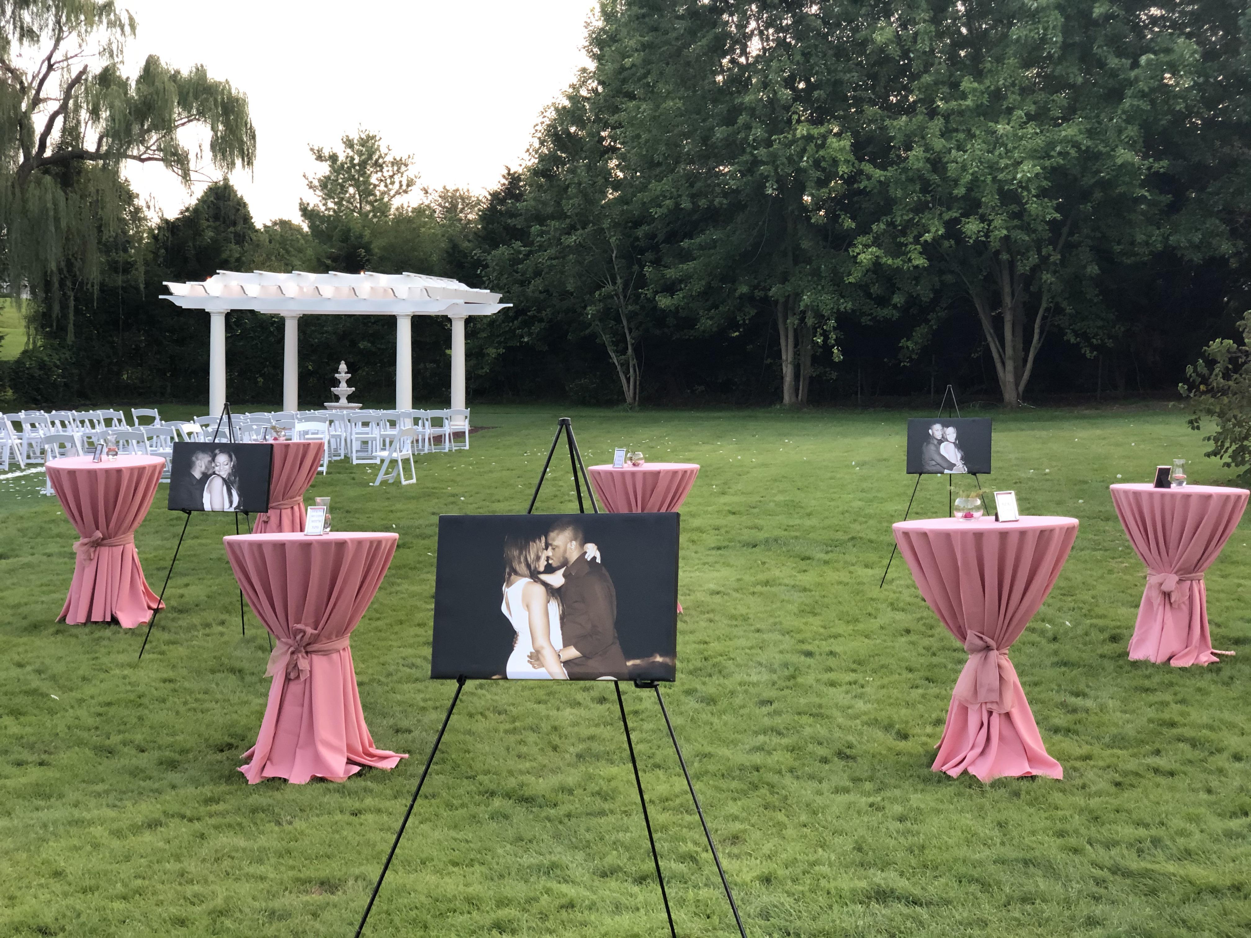 Our outdoor ceremony space features a charming pergola set on a peaceful two-acre estate, surrounded by trees and open green lawn. It offers a romantic, natural setting where couples can exchange vows in a calm and intimate atmosphere, with plenty of space for guests to gather and enjoy the beauty of the surroundings.